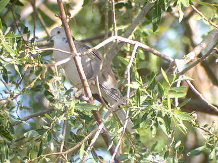 The photographed "collared" dove below was in a willow behind our house yesterday. We presume it's an escaped cage bird...we followed the sound of some cooo-cuoooing to a neighbor's large pen filled with a dozen or so doves. Based on the white under-tail coverts, we thought the photographed bird was a Ringed Turtle-dove. The very similar Eurasian Collared-dove, which has started showing up in Inyo in a westward expansion and has been reported from our neighborhood, has gray under-tail coverts.