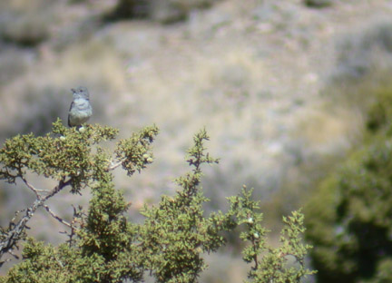 The habitat of the Gray Vireo is dry, impoverished, scattered juniper trees with good shrub cover. When we neared the proper habitat, Jon played a tape every couple hundred yards hoping to gain a vireo's interest. Nothing but curious Bewick's Wrens and Blue-gray Gnatcatchers. Finally, as we approached the area Tom and Jo documented Inyo's first certain Gray Vireo 11 years ago, Jon heard one singing partial songs down-canyon. Walking downstream we found a pair. We played the tape a few more times and the two birds flew around us from juniper to juniper. This area is so remote, the last people down there could have very well been Tom and Jo 11 years ago. We watched, photographed, and recorded them for 15 minutes.