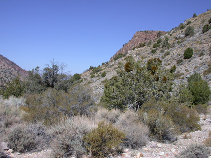 On 28 June 2002, we left Bishop in the afternoon. It was dusk by the time we neared the Grapevines and our truck flushed 6 or so Common Poorwills up off the dirt road. Parts of the road required four-wheel-drive, and one particular section of steep loose cobbles was too much to attempt in darkness. We camped under the stars in the pinyons. At 6AM, we again tried low range to get up the impasse in the road. The deep, steep cobbles and large boulders and holes were too much for our Toyota 4X4. We were just spinning our wheels so we packed a bunch of water and lunch and hiked about 3.5 miles over very difficult, steep terrain, much of which was trail-less