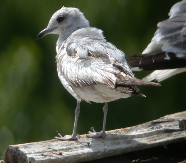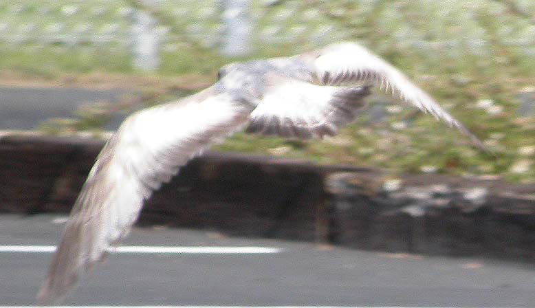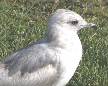 NGS, scope and binos. After much careful observing we phoned Jim to come see and get his opinion. He agreed too after studying the bird. We then phoned Heindels to make sure. They drove up and studied, photographed,etc too. After deliberation, it's agreed it's a Mew Gull. It was seen today too & can be found by looking for its shorter and narrow dark bill (gray with a black tip), dove-like face with a large dark eye in a seemingly smaller head and gray legs & feet. No hint of a hood or dark spot behind the eye as in a Bonaparte's or other small gulls. It is slighty but noticeably smaller than the Ring-billed that are present also along with the larger Cal gulls. Sometimes it rests on the gazebo roof and is tough to make out.