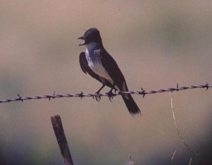 This kingbird was still near the wooden bridge at the east end of Jean-blanc rd, about 100 ft. to the S. along a canal & fenceline. He sits near the charred fence posts, which he matches. It must have bathed as it flew up from the water all wet, & proceeded to preen. No wonder, it's hot out there!