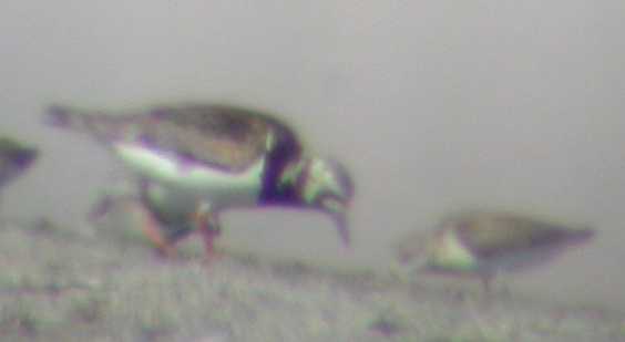 Single Ruddy Turnstone in bright plumage. Orange legs, flipping lakebed substrate. Black breast, black shoulder, white on forehead extends over eye and to nape and sides of neck ("face"). Dark crown. Relatively short bill (had length).
