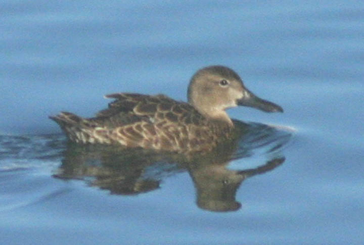 On 18 December a female-plumaged Cinnamon Teal was found at the Bishop Sewer Ponds. It lacks normal primaries (shot off?) and will not be flying any time soon. On 24 December the pond was surrounded and photographs were finally taken to substantiate this first ever December record for Inyo County. It is in the southwest-most pond and usually IN the reeds at the north end. It took two walks around the pond very close to the edge to disturb it enough that it tried to swim across the pond to quietier quarters at the south end. It has a very large bill, larger than a Blue-winged and smaller than a Shoveler, a very plain face with a small white spot near the base of the bill. The breast has warmly edged feathers and some of the feathers as you look towards the tail have a redder brown cast to them.