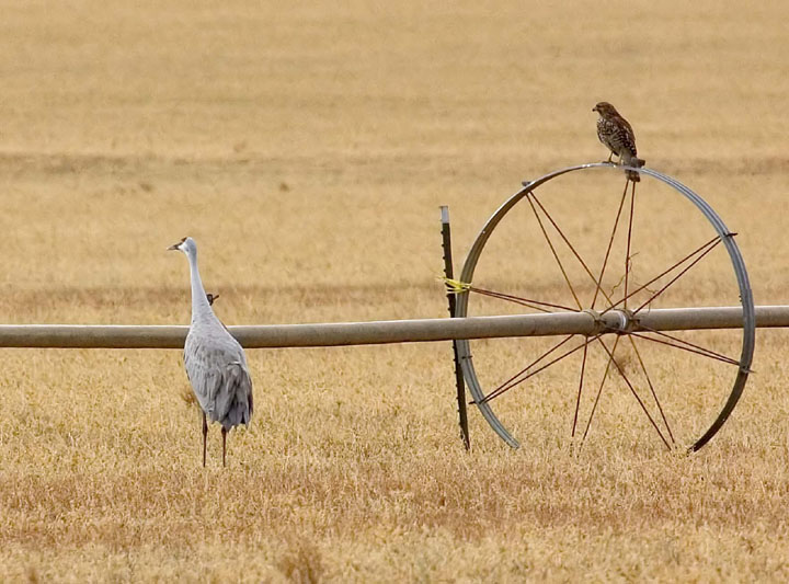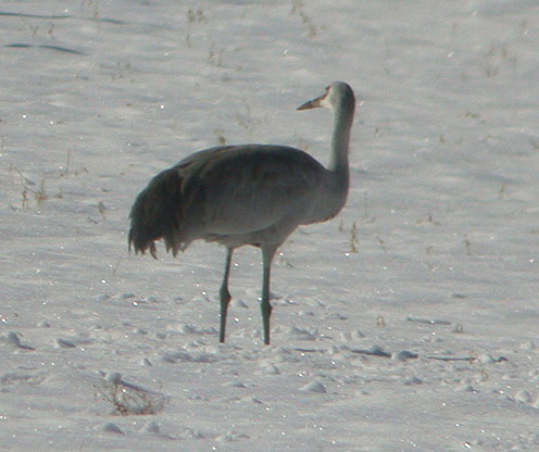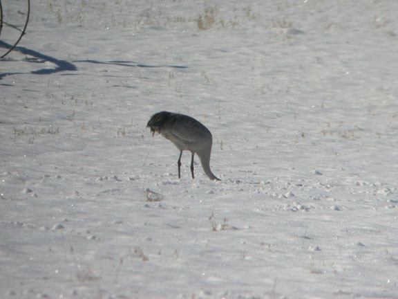 The Sandhill Crane found on the Bishop CBC (18 Dec 2004) by the Prathers continues today (6 Jan 2005) in exactly the same spot, although now up to its ankles in snow! The location is 0.35 mile south on Sunland from the junction of Schober Lane and Sunland. It's been west of Sunland in alfalfa field, near red irrigation motor.