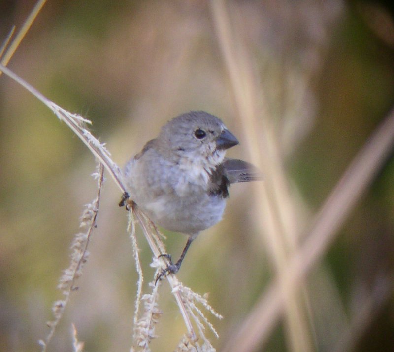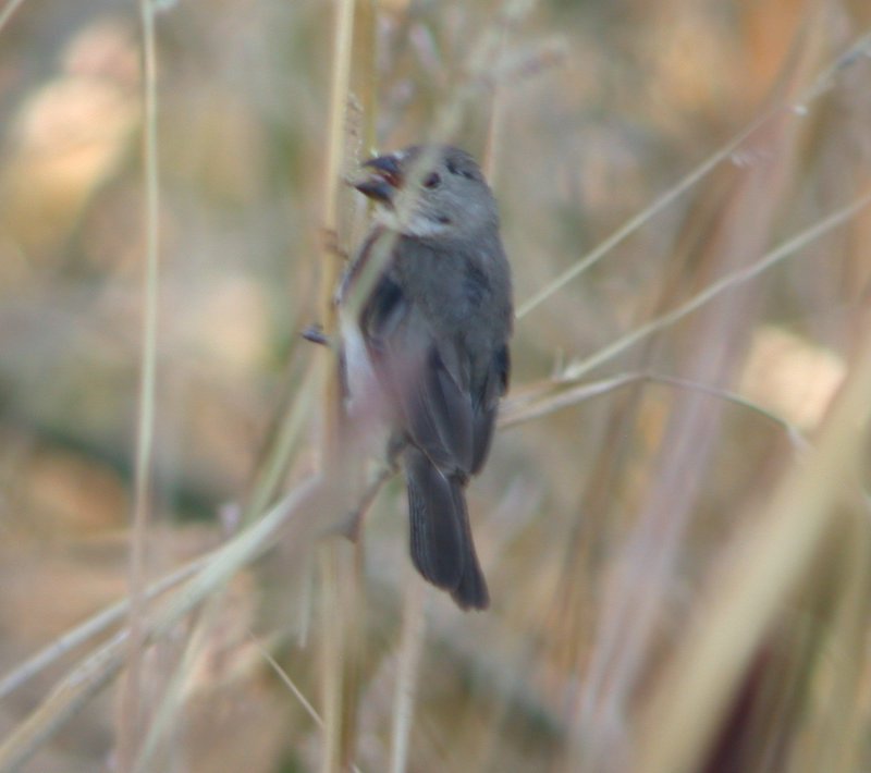 This morning (10 Nov), Rosie and I refound it at 7AM, and when Jon Dunn got there, his initial impression was seedeater. Tom and Jo also got scope views. Jon and I got some digiscopes. We wondered if it was an escaped cage bird. Tom, Jo, and Jon thought it may have been a hatch year male, potentially in supplemental molt, and if so, why would someone have had it caged and released it? The verdict is still out on which species of seedeater it is and how it got to Big Pine.