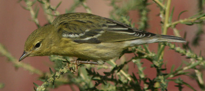 On 17 Sep a Blackpoll was found by Wurster and photographed at a time when rare in Inyo. The bird allowed close approach and it was easy to see the marks that eliminated Bay-breasted and Pine, which in fall can be very similar. Dunn found a Prothonotary Warbler (casual in Oct), and Wurster found a Northern Waterthrush (rare now). Dunn found a Chaetura swift that was studied hard and all agreed that it was a Vaux's, also rare at this time. The sad news is that one Eurasian Collared-Dove found Deep Springs so others are probably not far behind.