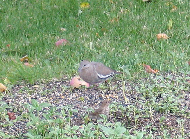 There was a White-winged Dove under my feeders this morning: Brownish wings, dark brownish square tail, light gray back, red iris, dark primaries, white border along wing. I watched it for about 5 minutes and it left when I tried to photograph it. I have up to 4 Collared Doves at my feeders every day.