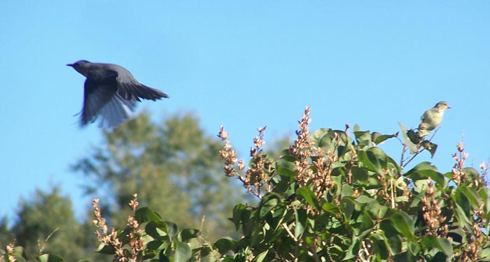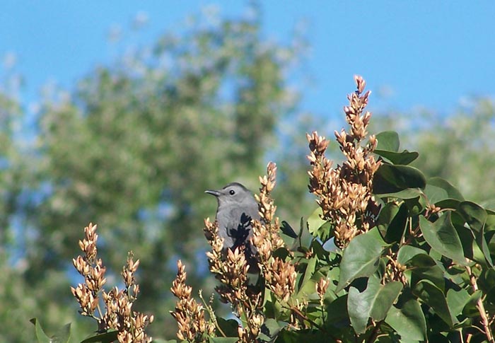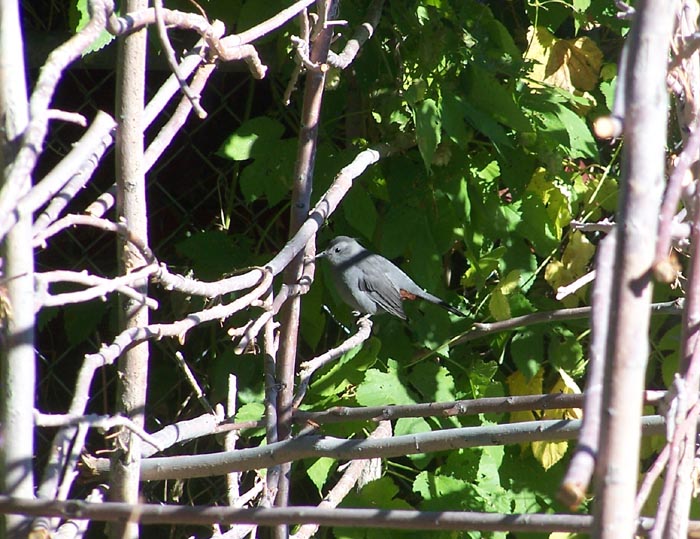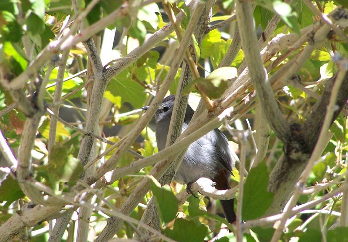 Kathy Virtue saw it first, wondering what the dark-bodied red-rumped bird was on the bird bath. We watched it for about 15-20 minutes as it hopped around in the lilac and foraged under the hops in the little backyard garden Kelly grows at the coffee shop. It mewed once and we cheered. Great bird with good coffee, it doesn't get much better. --Kathy and Doug, Kelly and Bartshe, Paul, Chris, Justin, and others