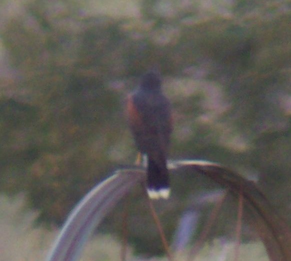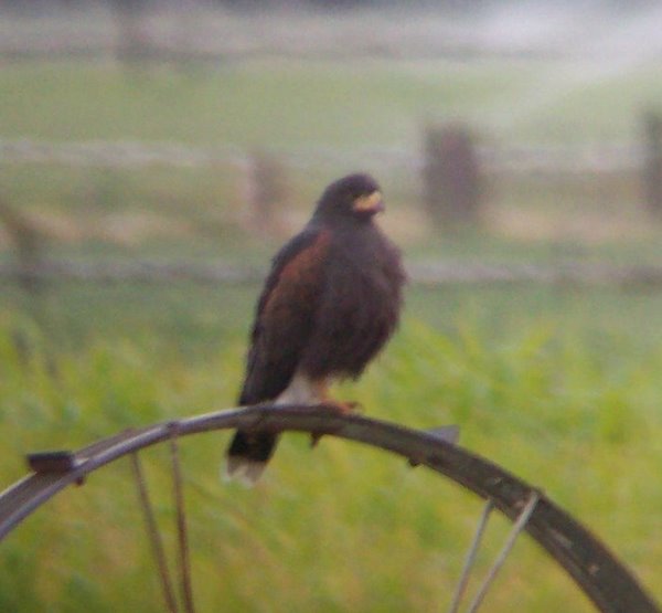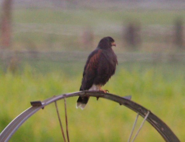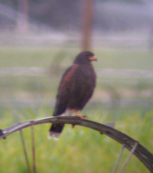 Douglas - Great find! We found the Harris's Hawk this afternoon (26 Sept) in the freshly cut alfalfa field east of Sunland Indian Reservation Road perched on the ground and sprinkler wheels. It was occasionally harassed by a Red-tailed Hawk and Northern Harrier; indeed the Red-tailed once attacked it landing directly on its back. We thought the bird was dark-brown overall with bay coverts. The tail was black with a somewhat broad white tip. The rump and undertail coverts were pure white. The legs were long and yellow with bay leggings. The yellow cere really stood out. We got scope filling views with James and Kay Wilson, Jerry Zatorski, and Tom and Jo Heindel.