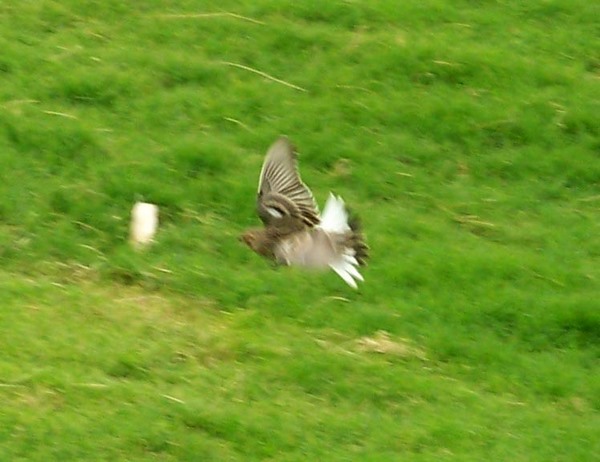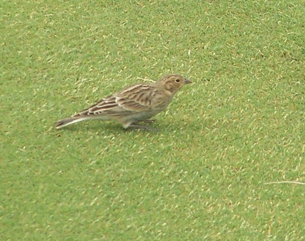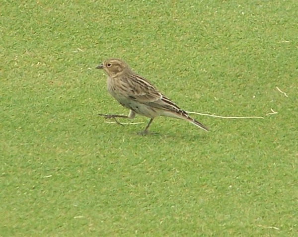 There were some good birds in Death Valley yesterday (October 1) as I drove back from the lower Colorado River, and they have inspired me to write another unnecessarily long post for this fine website. At dawn I saw the Northern Waterthrush that Chris and Rosie and Barb have already posted. Great bird. It was bobbing and running around in the little irrigated ditch that lines the eastern border of the Date Palm orchard between the general store and the gas station. At about 10:30am I walked down the paved road that skirts the northern edge of the golf course and heads to the airport. There was a single molting male Chestnut-collared Longspur foraging on the golf course. It was on the green (I think that’s what you call the finely mowed grass that surrounds the hole) of whichever hole is at the furthest northwest corner of the golf course. After watching three golfers hit their balls onto the green then putt their balls into the hole with the Longspur staying on the green but out of their way, I waited until they left and then walked out for closer looks. I got good looks at the tail, which has the characteristic black wedge at the far end of the mostly white tail. It also has the little black and white bars on the shoulder in flight, and still has a few dark feathers on the belly/flanks, which I think means it’s a male almost done molting out of breeding plumage. Also at Furnace Creek: 3 Red-naped Sapsuckers by the gas station, and 2 Wood Duck at the golf pond.