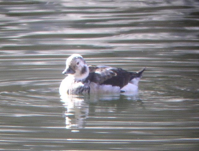 She or he was first spotted at the mid-point along the reservoir much whiter looking than the other duck nearby. Diving often it had a mostly whitish head with a smudgy gray crown and cheek patch. Her bill was short and rounded. Dark eye in a whitish face. Back was black with contrasting two long plumes across the back. White in front changing to black on sides then white in flanks. Short black tail above and white undertail. This sea dweller had a distinct way of diving, it would drop its head first into water, spreading its wings out and seemingly sink down underwater. It did stay under for a long time compared to other diving ducks we watched.