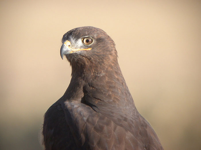 [Note from Chris: I had a tough time identifying this dark buteo. Douglas found it last week and was wondering if it were a Harlan's race Red-tail. The next day I saw it and didn't think it was a Harlan's, but instead felt it was a 'standard' dark morph Red-tail. Yesterday, 6 Dec 2006, I spent some time scoping the hawk (in the field along Sunland Indian Res Rd. It was on the southern-most irrigation wheels east of the road). With the scope, I could see feathered tarsi (legs), long yellow gape, and long pointed wings, all indicative of Ferruginous Hawk. I forgot to check for the white commas at the bend of the underwing in flight. Dark Morph FEHA are uncommon to rare; Sibley says only about 10% of the population. Several photos are are here: http://picasaweb.google.com/chris93514/DarkMorphFehaAtSunland?authkey=2dgg3_nldSI]