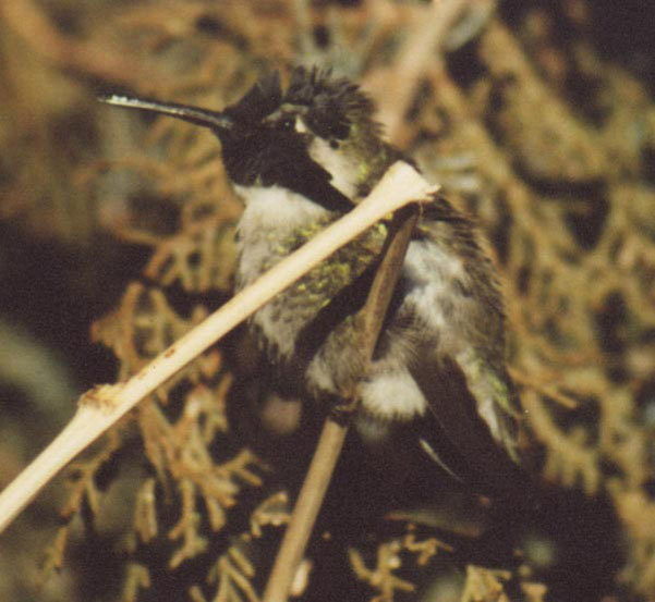 The thermometer read 14 deg. F this morning, so hope this guy does OK. He's in our juniper tree hedge right now and coming into our hummingbird feeders. This is a full adult male with a purple or black gorget, depending on the light & angle, which continues over his crown. The corners of the gorget extend out to a point and are narrow at tip like a handle-bar moustache. Below his purple gorget is a white "collar" and there is more white above the tips in the auricular area. His black bill is medium length and slightly curved down. His primaries are only slightly longer than his short subtly double-tipped tail. I saw him at 2:45 PM initially. What a treat!