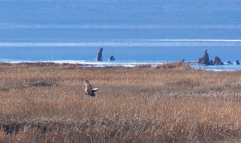 I have always wanted to explore Sammon Spring in the winter. It’s on the southeast side of Mono Lake, and it’s like a myth. There are two-story tufas, grass forever, and no sign of roads, wires, or humans. It’s always too far and too snowy to try to get there in the winter. But the springs are lush, and they support interesting things – particularly migrant shorebirds. Today was the perfect opportunity: calm, with hardly any snow. The sandy two-tracks are frozen and easy to drive. The marsh at Sammon Spring is usually very wet, but today it was very frozen, and I skated down to the lake. But sometimes myths are myths because you can’t get to them. The frozen grasslands were easy to walk through, but they had frozen out the birds. There weren’t any shorebirds – there wasn’t a shore. Mono Lake is so high that the lake edges right next to the grass and ice. 100% of the ducks were Mallards. Mal-lard. Maybe French for Beautiful Place Lacking Birds. Or French for trans-fat. There was a male Short-eared Owl, and a female Northern Harrier. And a lone Red-winged Blackbird. She was the most-unexpected thing, I don’t know what she was doing out there (besides clicking at me). Three Marsh Wrens, two Juniper Titmice, and a shrike in a buffaloberry tree. I tried the Rush Creek delta, and that was just as surprising: just two coots. Eerie! Perhaps all of the birds are at the Mill Creek delta. Or in Mexico. But Mono Lake is definitely devoid of bird food right now: all of the Mallards were in the cattails at Sammon Spring, far from the lake.