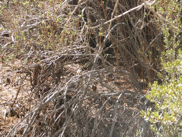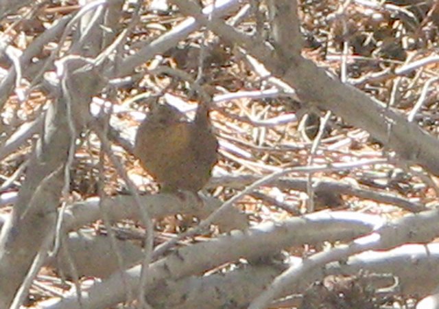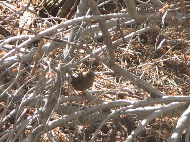 Egypt Creek has hosted one, probably two, Winter Wrens since at least 11/24/06. During my previous sightings, the Wren usually called with single "chup" calls, although a double "chup" is apparently expected. On March 18, 2007, the mouse-like reddish wren made up for it by perseverating a double "chup" call, over and over for about ten minutes. During which I snuck up on him and picked him out of some mountain maple twigs and leaves. Soon he began to sing!!! Not a full-throated song, but a "whisper" song. Perseverated on this, too, going a timed four minutes without stopping. His song blended magically with the trickling of tiny Egypt Creek. Attached photos will include one full size of habitat, and two crops. A difficult bird to photograph: