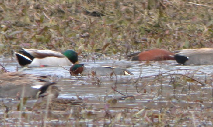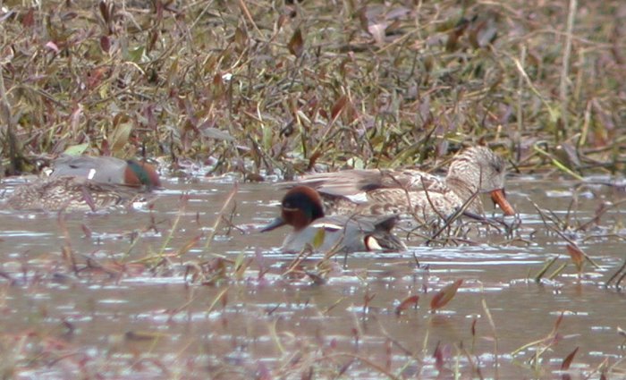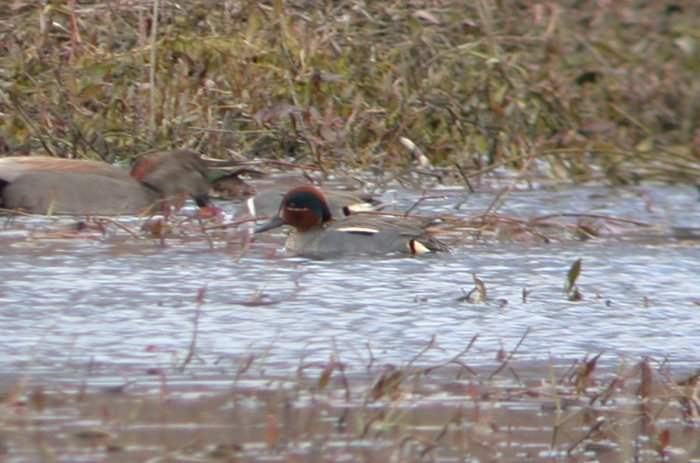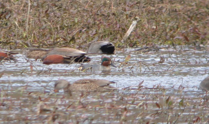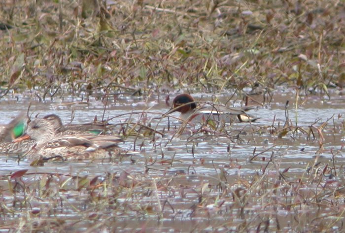 This afternoon, 27 Mar, Jon Dunn and Andy Zdon found a male Eurasian Green-winged Teal at Farmer's Pond. It was in the north-west, muddy fringe of the dwindling pond alongside a dozen or so American Green-winged Teal, another dozen Cinnamon Teal, Mallard and Gadwall. Jon said the Eurasian is not paired up with a mate and it is missing one foot; it hobbles when trying to walk. Jon thought it might be 99% A. c. crecca; the right side shows a faint, pale vertical stripe at the shoulder (see second photo). Neat bird, and perhaps the first A. c. crecca for the Eastern Sierra.