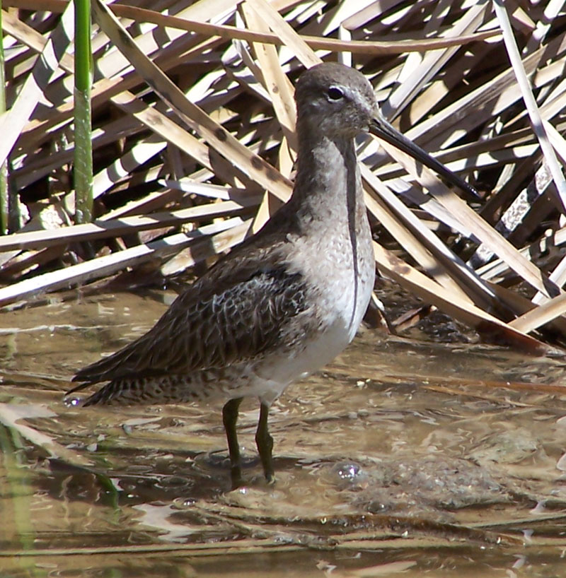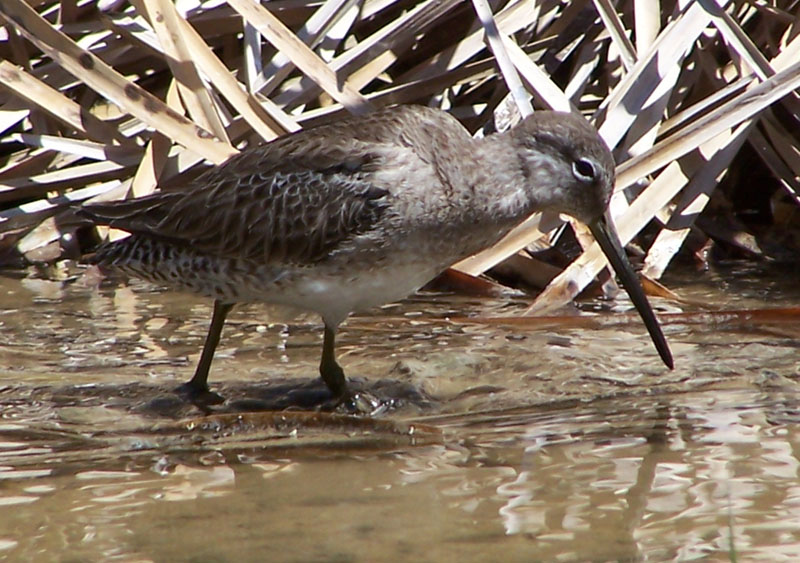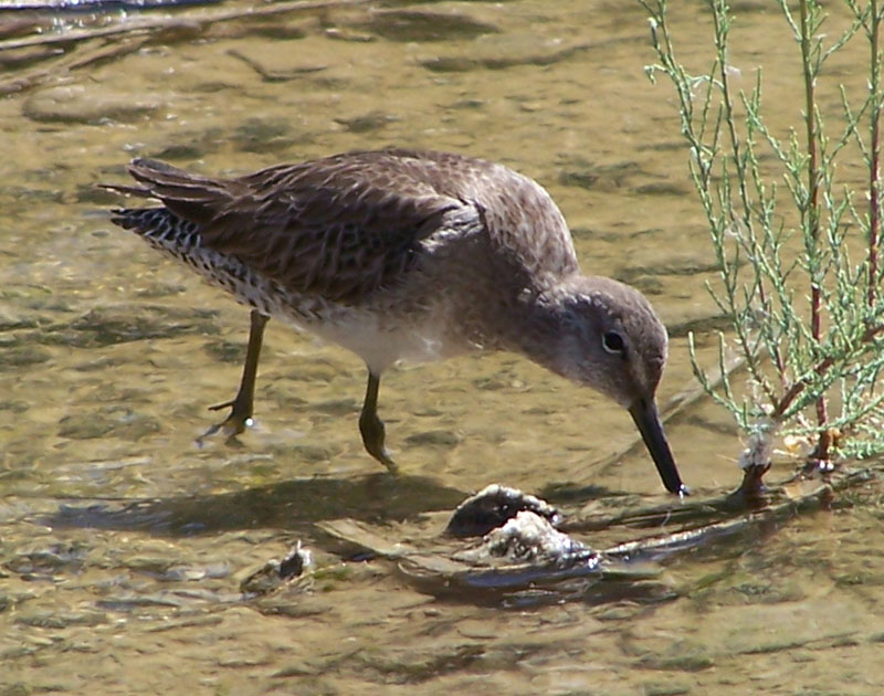 I forgot about this one. I believe this is a Long-billed Dowitcher, but I'm not completely sure. Perhaps someone can help with the id. I should have had my Birding magazine with me. The poor thing has a lame leg, thus the easy photos. It fed voraciously, but it didn't seem to have the energy to fly further than three or four feet in a spell. This was at the Amargosa Canyon, .5 km south of the edge of the burn.