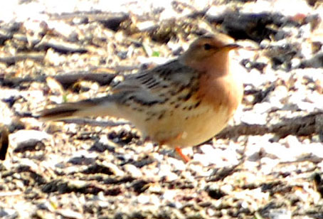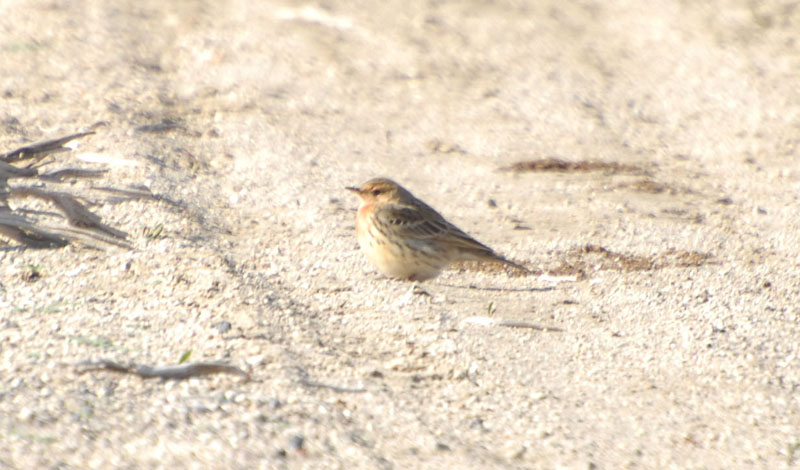 While birding the Layton Springs area of Crowley lake today I was fortunate to find a Red-throated Pipit. While admiring the nice alternate plumaged American Pipits, I heard it fly in with a very distinctive call I recognized. It landed and I was able to see it very closely as it foraged near the shore. Probably a male, it had a nice cinnamon-orange throat and upper breast. The face was this color as well (but a little paler), setting out the beady dark eye. Crisp, thick dark streaks on sides of breast and flanks. Pale legs. Distinctly streaked back against a warmer, brown back color (grayer on the Americans). Distinctly short tailed and squatty. I called Jon Dunn, who luckily was home and brought along Debbie House and Andy Zdon. Debbie got many photos. Was fantastic and fun that we refound it - spent much time with it. From Benton x-ing rd take the Layton springs turn off - the bird was with 20 or so American Pipits north of the Layton springs area - and north of the little creek that feeds into the lake that the shoreline dirt road crosses.