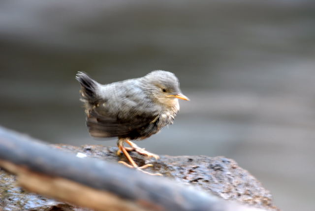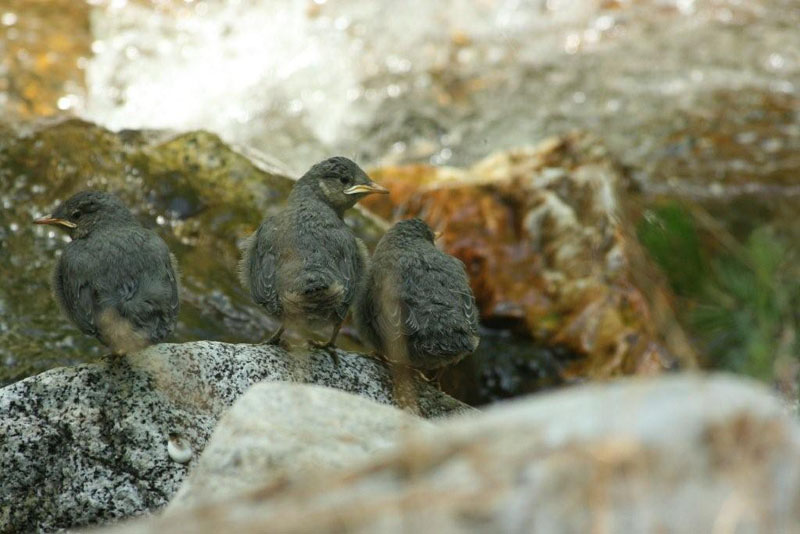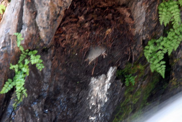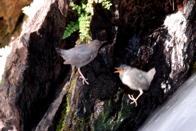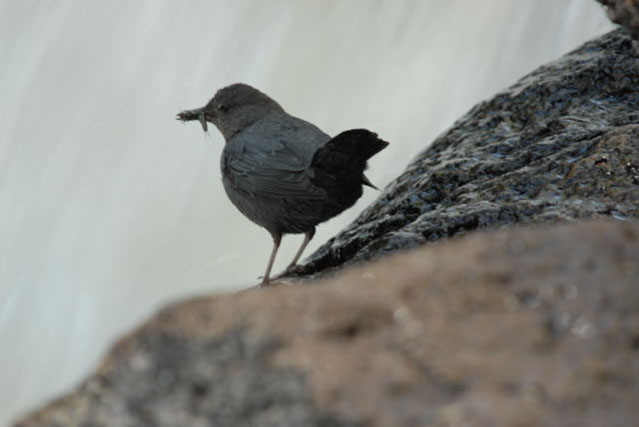 We have been a privileged observer of an American Dipper's nest site situated along a fast running stream on a rock outcropping facilitating a small waterfall. The dipper's nest is absolutely inacessible by man or beast yet, in an easy to reach spot for the dipper parents. The nest is an intricately made mound of mosses on top and grasses inside. The spray from the creek keeps the moss moist and alive looking. The eggs are laid deep within the nest and are entirely covered over by the mosses on top. There is an entrance to the nest either on the side or the bottom of the nest. According to Armstrong and O'Clair (1994) there are 5 species of dippers worldwide but only one American dipper. The American dipper spends its entire life along small, clear streams. It is a year-round resident of Alaska and can be found throughout North America along mountain streams. Dippers do not have webbed feet but they do have long toes and use their feet and legs to paddle across water. Dippers also walk along the bottom of fast moving streams using their short stubby wings to stay submerged. The major food source of the dippers are aquatic insects. Two of the most important requirements for the American dipper are clean streams and protected nesting sites. Good water clarity is a necessity for the dippers so they can see their prey. The dipper's plumage is very, very dense. The dippers have a heavy coat of down between the rows of the dipper's feathers; similar to ducks and other waterfowl (Armstrong & O'Clair, 1994). The down gives the dippers excellent insulation and with less than a 3-fold increase in their metabolism, they are able to maintain normal body temps when the air temps are as low as 40F below zero. Fascinating to note, many dippers spend their lives in one watershed. Also the dipper is highly territorial. Most of the dipper's movements are from the spring/summer nesting time which is usually upstream then moving downstream to ice free areas in the winter. The dipper's that live on the North slope in Alaska inhabit ice-free springs on the slope during the winter. The dipper's also have a very melodious song and is compared by Armstrong and O'Clair to some of the best notes of wrens and thrushes. Armstrong and O'Clair state that most streams have very few adequate nesting sites for dippers. Therefore identification and protection of dipper nesting sites may be a crucial factor in keeping dippers in a particular watershed. It has been a great joy and privilege for Bob and I to have watched the dipper's these past 5 weeks. John Muir Laws states in his field guide that the American dipper, aka Water Ouzel, was John Muirs favorite bird. I can imagine John Muir hiking the Sierra's and coming across the Ouzel running across a fast moving stream. One can surely spend hours watching this fascinating bird. Reference: Armstrong, R.H. & O'Clair, R.M. (1994). American Dipper. Retrieved May 29, 2007 from, http://www.adfg.state.ak.us/pubs/notebook/bird/dipper.php