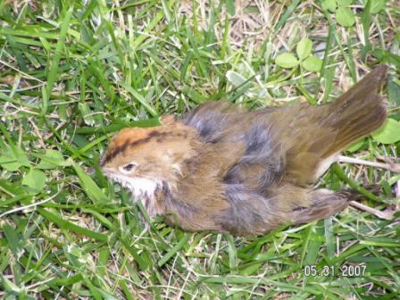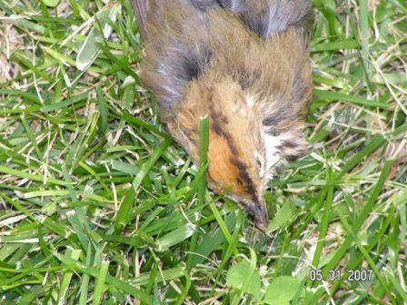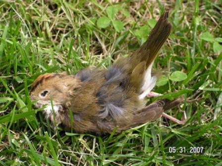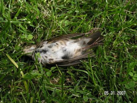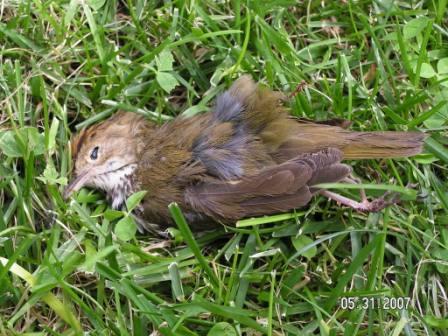 I found a dead Ovenbird in my yard on June 1st. I am not familiar w/ this bird & am a VERY amateur birder. I looked it up in my Nat'l Geographic Society Birds of N. Am. book. That book said it was a rare vagrant to the west so I began to look on-line. That's how I found this website. I took digital pictures, see below - & the body is still here. Hope you find this sighting interesting!