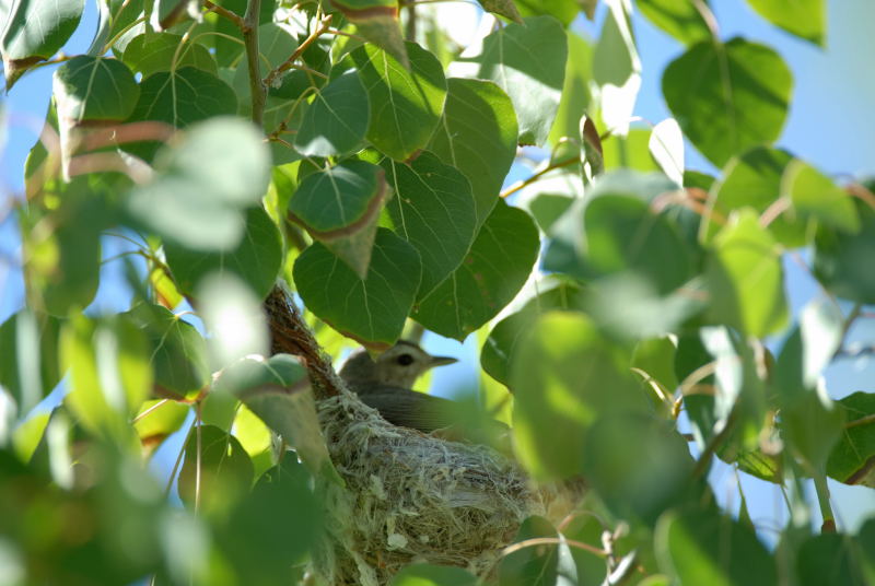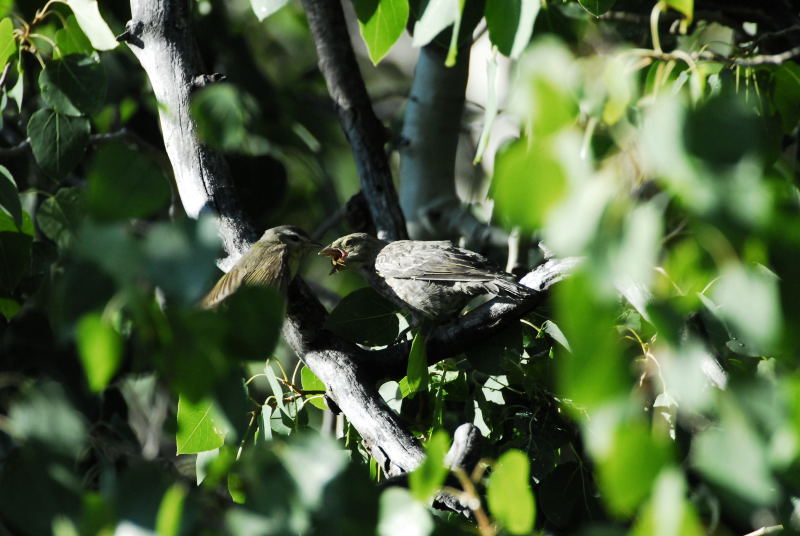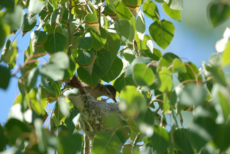 Hi everyone who loves birds; I have been away for awhile and now am back in Mammoth. Just prior to leaving I had been watching two black-headed grosbeaks on their nest. They fledged 3 chicks in 7 days; extremely fast but within their range. However, when the chicks left the nest they were hardly able to get around and the parents had to feed them and give them flying instructions. As I followed the chicks and parents around the aspen forest I found myself under a small aspen tree which had a vireo nest in it. The nest, beautifully made and attached tightly to a branch contained 3 chicks, just hatched. The parents were warbling vireos of 2 of the chicks, the 3rd chick unfortunately was a brown-headed cowbird. I left shortly after spotting the nest. Now one month later I ran into the WV parent feeding a rather large brownheaded cowbird. I am posting a few photos of the nest before the chick was fledged and of the parent warbling vireo with the cowbird chick taken today. Unfortunately there is no sign of the other 2 chicks and this saddens me. Quite frankly we know that brown-headed and bronze-headed cowbirds are predators of certain songbird species and the WV is one of these. I feel quite certain that the large cowbird probably pushed its competition from the nest and thus is the sole survivor and inheritor of the WV's parentage and bountiful feeding techniques. Hence, we are the spectators to what is called "brood parasitism." My husband says it is repulsive; I do not find it repulsive but it does sadden me. Our avian friends work so very hard to reproduce, they put such enormous effort into the act of reproduction and it is hard for us to see this little bird, so full of energy feeding and nurturing the very enemy of its own survival. Yet, this act of predation has been on-going for centuries and the species which are parasitized persist, as well as the parasitizer. So I again stand speechless at the magnitude of nature's bounty and tenacity.
