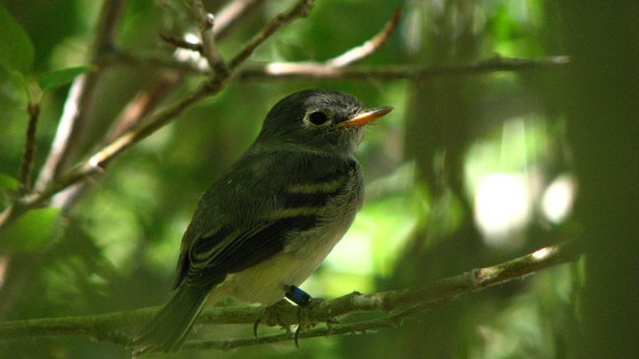 Hello! It's the first week of August, and a drought year. Juvenile birds are already dispersing from Rush Creek, as are their parents and adults that failed to breed. As many of you know, I color-band Willow and Dusky Flycatchers on Rush Creek, and I am hopeful that you may keep your eyes open for color-banded birds. I use these colors: blue, red, green, yellow, orange, white, black, and mauve. There will also be either a silver federal, numbered band, or a red, federal, numbered band. Combinations are either two colors on the left leg and a silver or red federal band on the right, or two colors on the right and a silver or red federal band on the left. Color combinations are read from the bird's left leg to its right, and from its body to toe. Thus the Dusky Flycatcher fledge in this photograph is Silver/Blue-Black. Silver on the left leg, which is hidden, and blue over black on the right. Thank you very much for keeping an eye out for my birds. A re-sighting would be a fascinating find!