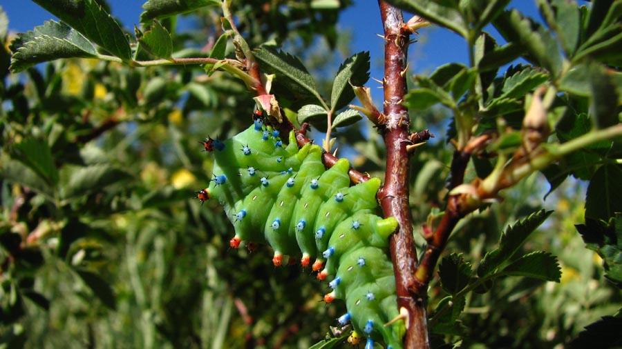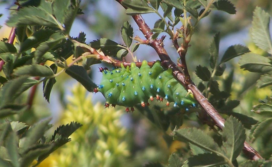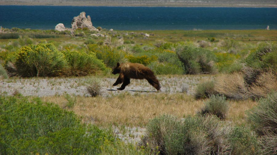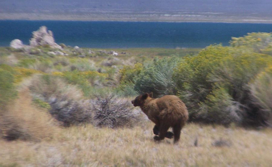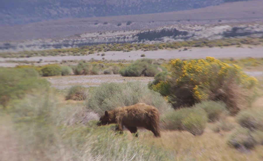 After a marvelous breakfast in the house of happy soon-to-be parents, I posed the question: “So, who wants to jump in McCreedy’s jeep and head out to Sammon’s Springs?” Four of us did, and we headed off to spend Paul’s first day of paternity leave loitering in the tufa-infested marshes on the back side of Mono Lake. Our first sighting was unbelievable, a blonde black bear foraging in the sagebrush well east of Willow Springs. The wind was with us and we got many good pictures in more than five minutes of watching this smallish hungry bear before it finally spotted us and bolted toward the lake. Later we enjoyed a single Mockingbird – quite the enigma at Mono Lake – and three Western Kingbirds above Tower Tufa’s marsh where blooming rabbitbrush fades into blooming goldenrod and you can hardly tell the difference. In a grove of Wood’s Rose at the marsh’s edge we admired the enormous and beautiful caterpillar of a Silk Moth. Down on the lake 14 Caspian Terns were loafing with many more California Gulls, a single Marbled Godwit, two Dowitchers and assorted Calidris. Two male Black-bellied Plovers in handsome breeding plumage inspected the fresh-ish lagoons, and thousands of Phalaropes of both species swam in circles as a Savannah Sparrow died in the talons of a diving Prairie Falcon. All six species of swallows were swarming above, the most numerous being migrating Banks. We saw Tree Swallow last as the four of us sat naked on the shoreline after a perfect swim and he swooped down in front of us all catching the sun on his sparkling blue face and back. It was a beautiful day. Congratulations Paul and Yvette!