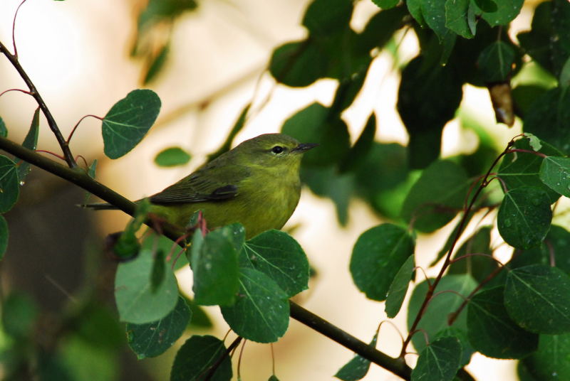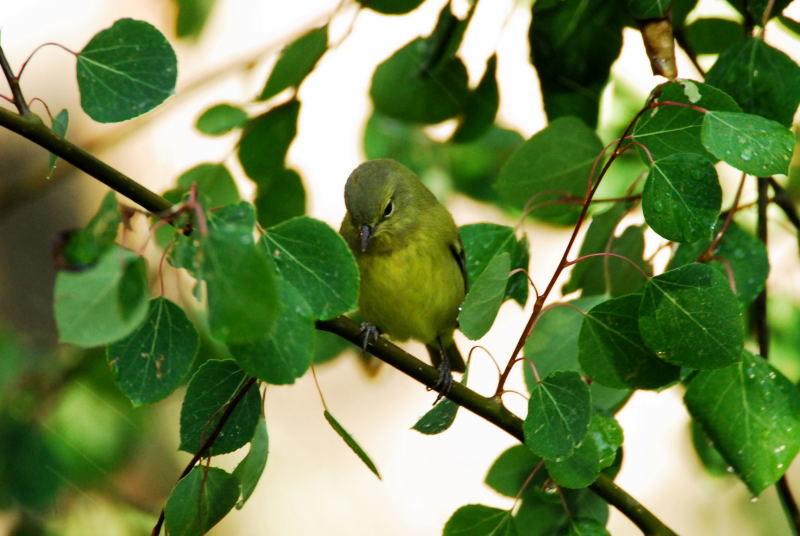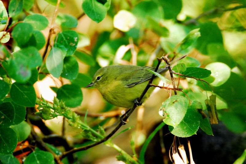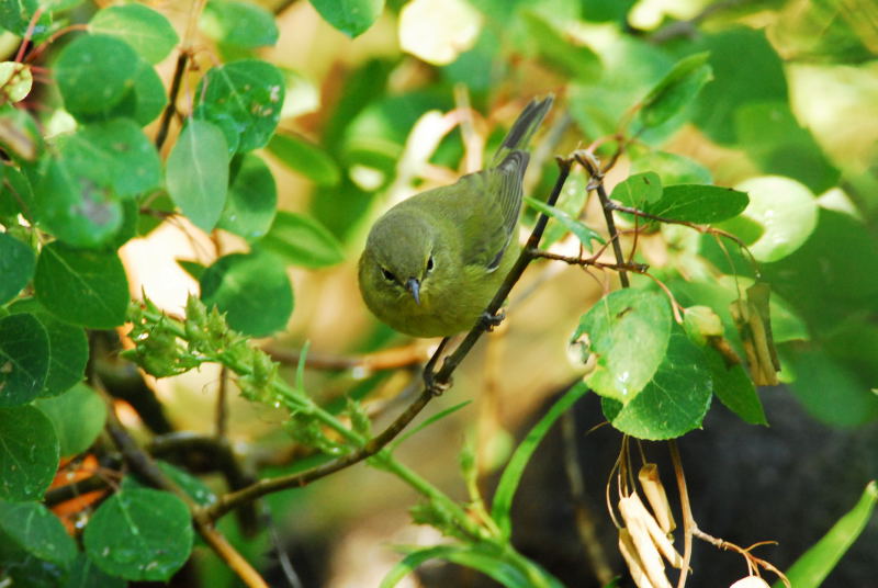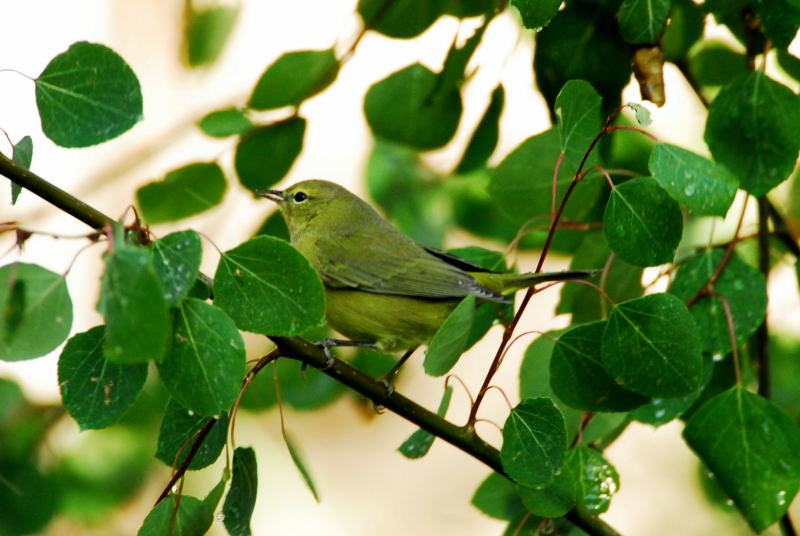 This beautiful little warbler is called the orange-crowned warbler (western version as opposed to the eastern orange-crowned). Orange crowned warblers are definitely found in the Sierras both sides of the crest. Peterson’s field guide states that this warbler is far more abundant in the West than in the East. They describe the OCWA as a rather obscurely marked warbler and one that varies from “drab olive-gray to olive-yellow showing some indistinct streaking upon its’ underparts” or breast. In my photos one can see the streaking on the breast. As for the orange-crown it is seldom seen. However, one of my photos does show the orange crown as the tiny warbler was bathing under my sprinkler and she shook her head and though this made the shot a blur one can see the blurry remnants of an orange splotch on the top of her head. There are different races and as Chris pointed out to me this one is the west coast subspecies, lutescens which has the brightest upperpart coloring, the dullest being found in nominate celata. But all of this can be found in Peterson’s FG on warblers. In this little guy I love the split eye-ring that one can see so plainly in the photos. The FG says there is little seasonal change in plumage and that males are slightly brighter than females and have a larger orange patch (usually concealed) on the crown. The species that are the most similar to the West coast lutescens are Wilson’s, Yellow and Macgillivray’s warblers. Fall migration with this warbler is protracted with a peak in late August and September. This little warbler dropped into my yard for a dip in my sprinkler. I have no lawn, my place is in Mammoth at 8200’ the yard is filled with aspen and native plants and watering is done by hand, frequently. The yard is filled with birds and I was just lucky to be outside at the time with my camera when this little beauty dropped by for a leisurely dip in the water.