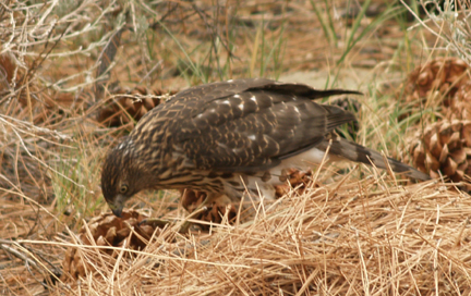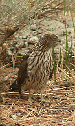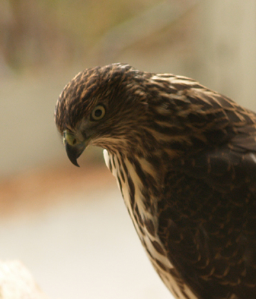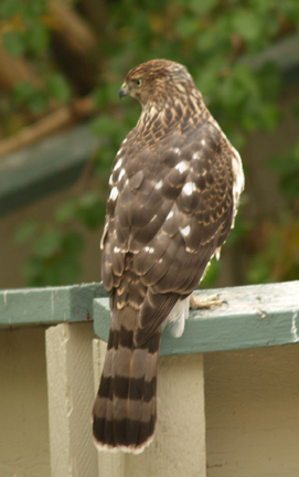 This Cooper's Hawk has appeared last weekend and also today, Sept. 20. A large female looking for a meal from the birds around my feeders. To her dismay, she wasn't successful but was looking around for any chipmunks or squirrels that she could find. I'm sure she'll try again.