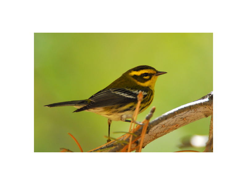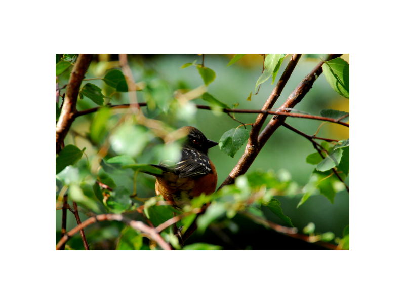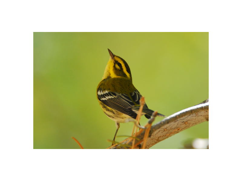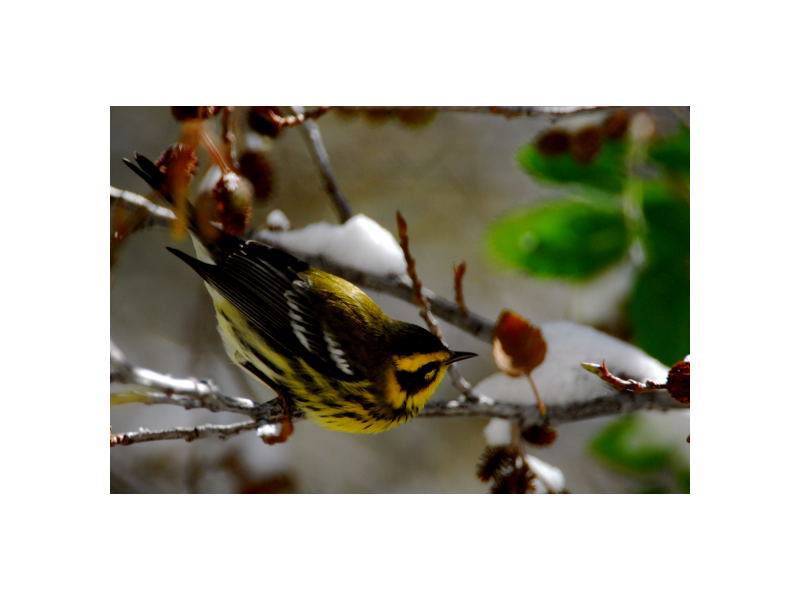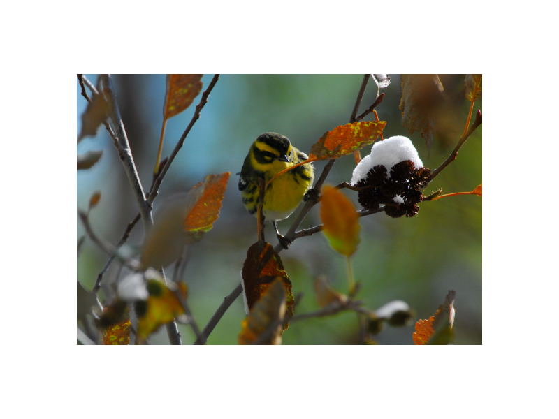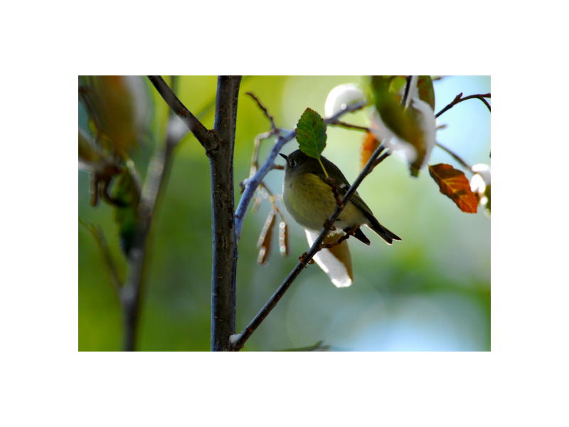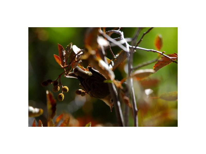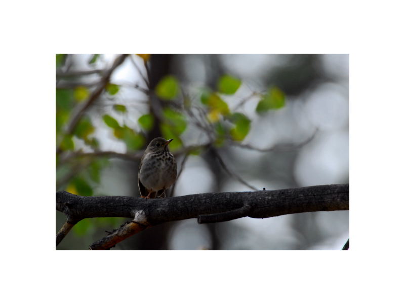 As the days get shorter and colder the nights, the birds passing through the mountains are numerous and intriguing. Townsend’s warbler with their bright yellow face and eye-mask of black, darkest green cap and back slightly streaked with black lines (females) belong to the virens (Black-throated green warbler) complex and are related to the Black throated green, Golden-cheeked and Hermit warblers. The Townsend’s breeds in the northern coniferous forests, such as the Cascades in Washington state, where it is moist and cool and they winter in the coastal woodlands of California, the highlands of Mexico and northern Central America. Hybridization occurs when the range of the Hermit warbler overlaps with the Townsend. In the winter these warblers are very often found in mixed flocks of small birds, such as Kinglets, chickadees and other types of warblers. This is how I found them along Mammoth creek. With much calling and chip notes their small flock would move over the alder and aspen growing along the creek or they would forage at any height amongst the firs and Jeffrey pines lining the slope above the creek. Foraging with the Townsend’s were ruby-crowned Kinglets and mountain Chickadees also joining the mixed flock were 2 warbling Vireos and at least 1 Hermit warbler. It was interesting to note that everytime I spotted the Hermit warbler it was high, near the top of a conifer which is their preferred foraging spot. Hence, I was not able to easily photograph the Hermit warbler whereas the Townsend’s and the Kinglet’s foraged all over and at any height. The pine siskin, photographed in my yard, is not a neotropical migrant, like the Townsend’s warbler and the flycatchers. They, like the mountain chickadees, may remain throughout the winter. When the ground is blanketed with snow and the temps dip they will brighten our day along with the nuthatches, woodpeckers, Stellar’s Jay and other birds that will remain. Siskins, redpolls and goldfinches are a closely related group of “seed specialists.” The Siskins like to feed in flocks, which after breeding, may number in the hundreds. Last winter, which was a mild one, several Hermit thrush took up residence at the creek. Perhaps the photo of the Hermit Thrush is one of these and he intends to stay. Time will tell. The Townsend’s warblers were here in the mountains just 3 days ago, when we had our second snow I watched them forage through the aspen/alder thicket as lumps of snow melted and fell off the nearly leafless bushes. They have departed; however the ruby-crowned Kinglets remain still gleaning the bushes for every last insect they can find to devour; their round, plump bodies flitting from branch-to-branch, from leaf-to-leaf… They are fun to watch ….they winter south from southern B.C. and California and across the southern tier of states to southern New England.