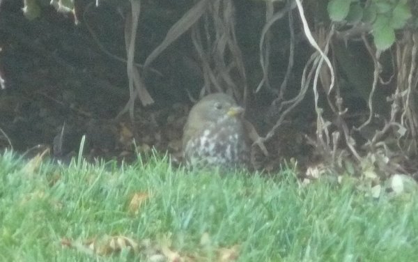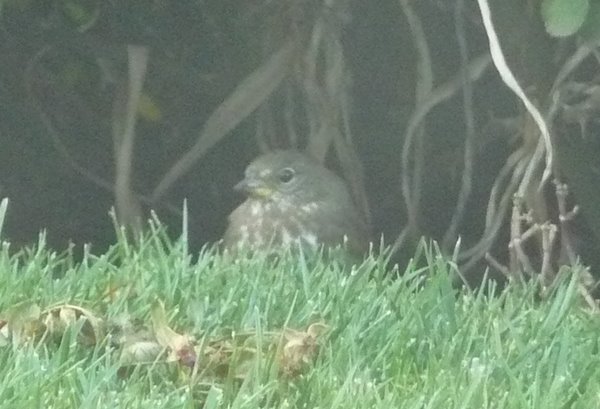 Scratch, scratch, scratch... We've got a Sooty Fox Sparrow in our backyard and it's doing what it does best, the Fox Sparrow shuffle. This bird has a dark brown head and back (no streaks), and mostly dark-brown-splotched breast. The lower mandible is yellow and so is the base of the upper mandible. Sooty is the race that breeds from Coastal British Columbia to the Aleutians. We think this bird is of the lighter-brown unalascensis group that breeds from the Aleutians to the northern Alaskan panhandle.