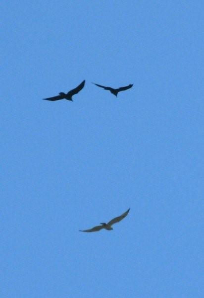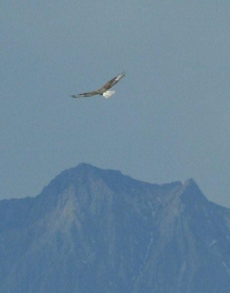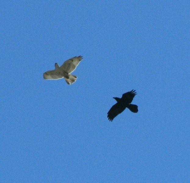 A pale buteo sitting in willow west of Meadowcreek showing dark legs which form a "v" in flight and contrasting with a pale belly. This wintering hawk also had a pale unbanded tail indicating an adult. Pale windows in wings are also called "whitish primary panels" in Wheeler & Clark (1996). It was subsequently chased around by a Red-tailed Hawk and a pair of Common Ravens who have territories in this area.