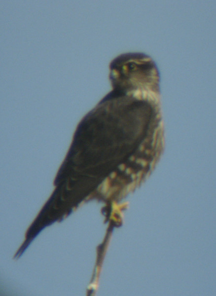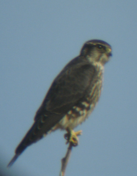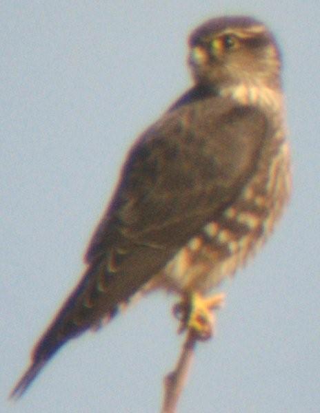 Our group enjoyed scoping this female Merlin with a dark-brown back probably of the Taiga group. She also had thick dark brown streaks down her white breast & belly and a distinct white supercilium. Her moustachial stripe was weak. Ron spotted her while she sat atop the tallest poplar tree near the pond and Nancy took photos through the Leica Scope (to follow). Later Mountain Bluebirds were seen on Sunland Rd and Claus pointed out a dark morph juv Red-tailed Hawk which he had also seen the day before.
