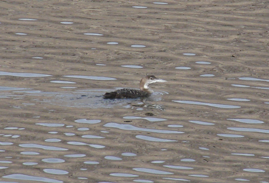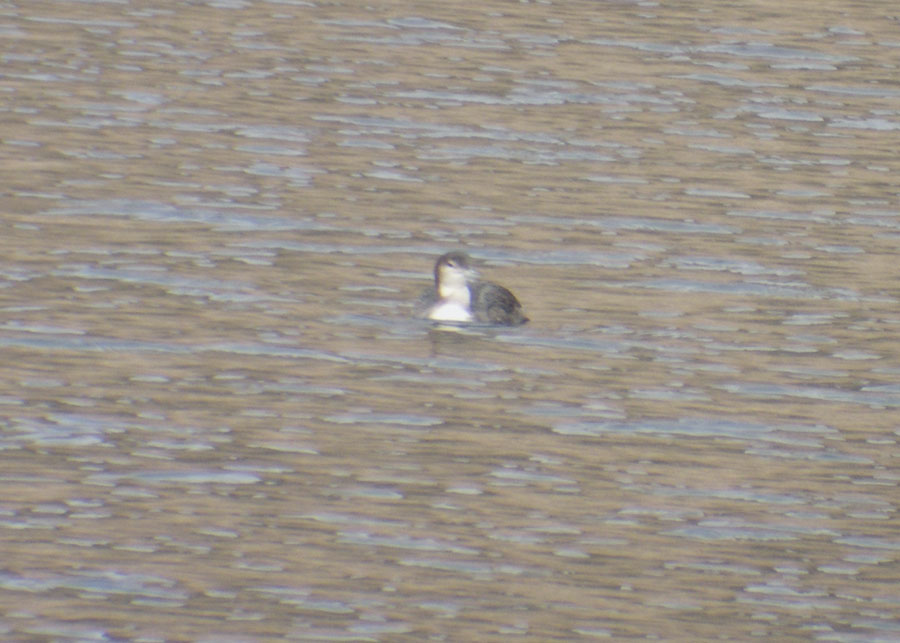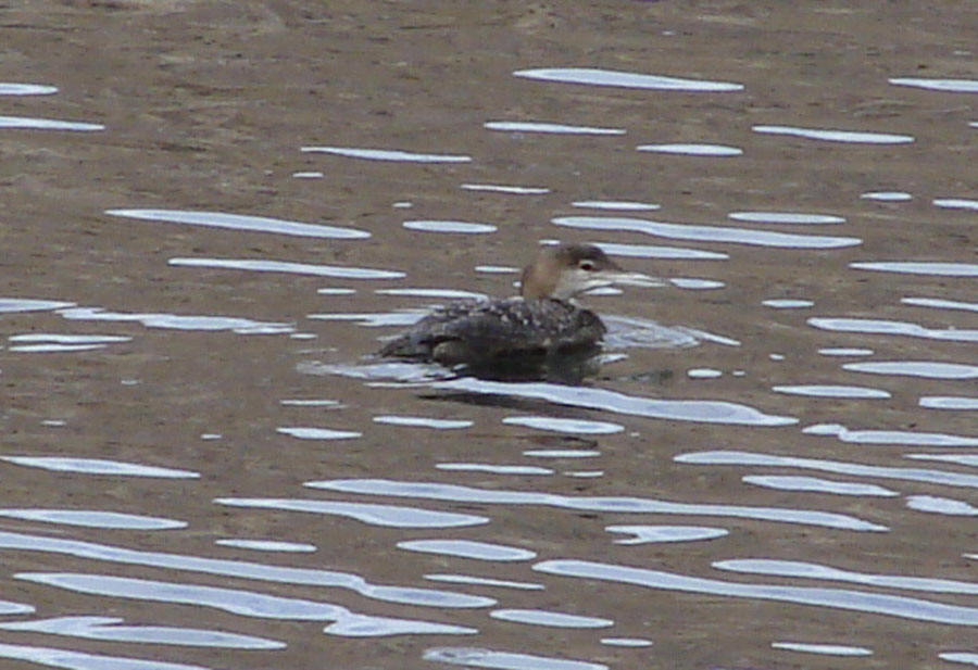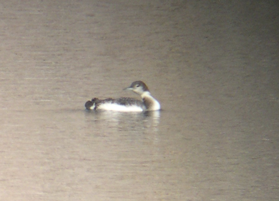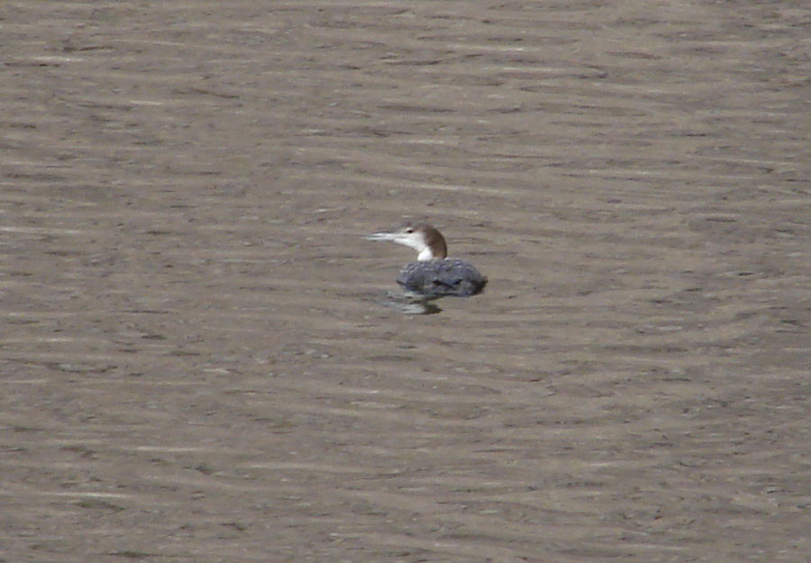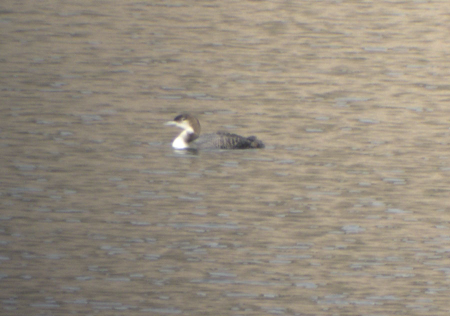Seen at the NW end of the reservoir. Photos to follow. Large loon in basic plumage with large bill. Bill was gray, long and somewhat thick. It would wrap around to beyond the back of head. The head was flat topped, not rounded, dark crown down to dark eye but with white partial eye-ring in front of the eye. White chin and throat but with two dark extensions from the dark neck (back & sides) that extended into the white of front of the neck. This made a horizontal line in the neck or "shelf". Checkered board look to the medium brownish back with white. We had good close looks through our scopes, as close as 100 yrds. We carefully covered the reservoir but didn't walk up the creek to powerhouse. We had nine species of ducks.