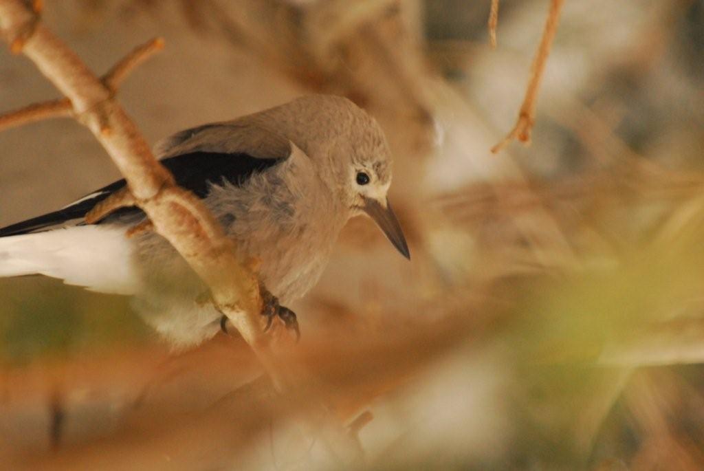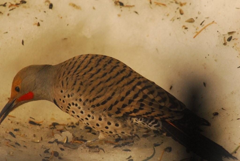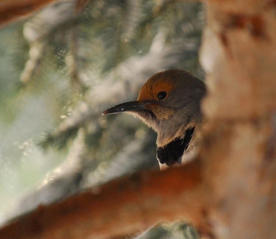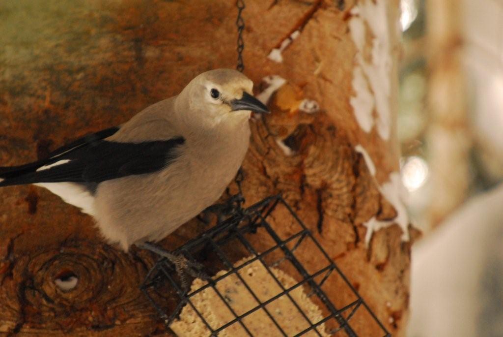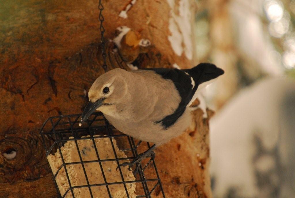 Well here it is end of February and another winter storm watch issued for Mammoth. I watch the snow coming down now, gently and ever so quietly; it is nearing dusk. Only juncos, and mountain chickadees at my feeder station. All the suet eaten for the day and the big birds gone. So, you say, what big birds come for your suet, Ms. Willey? Well, my favorites are the Northern Flickers (red-shafted) the male with his red mustache marks and the female just a little bit less assertive. They arrive early in the morning, they have to get in before the high elevation, Clark's nutcrackers arrive in their noisy flock, calling and bouncing from branch to branch. The Clark's nutcrackers in our area like the high elevations in the spring and summer; when fall comes they start descending to lower elevations which in this case is 7000-8000 feet. Our house sits at 8200 feet and all winter I have been watching the Clark's come for their daily allotment of suet. I have watched a single Clark's, with it's massive beak, methodically tear through a suet bar which is soft not frozen (this means I just hung it up and it wasn't hanging outside all night) in approximately 2 hours. The Flickers are very cautious when a Clark's is around even though both the flicker and the Clark's have about the same size beak. It is just that a Clark's beak seems more imposing. They use their beaks to pry open pine cones and the white-barked pinenuts are one of their favored foods. In this area the white bark pine tree is a high elevation pine tree. I don't believe it is found lower than 9000 feet in the Sierras. The other woodpeckers that come to my suet bars are medium sized birds, smaller than the flickers. The white-headed woodpecker and the hairy woodpecker are 2 frequent species visitors. I have 2 first fall/winter Hairy woodpeckers that arrive with regularity and the way I know one of them is the male was a victim last summer of one of my windows. I took him to the Eastern Sierra Wildlife Center where Cindy Kammler was able, after a week, to rehabilitate him and send him back to Mammoth and my home and release him. He has little fear of me and most Hairy woodpeckers are rather shy around humans, but not "Hairy." Also he has a bit of a crippled leg which is recognizable if you are looking for it. My "Hairy" is very bold and will not let the male white-headed woodpecker send him flying but will assertively keep his place at the suet feeder. I think he has made me and our suet feeders his territory so he feels secure when he flies into our fir trees to feed. Usually, though, I have noticed that hairy woodpeckers are timid and will give up their feeding spot to the white-headed woodpecker which is a more aggressive woodpecker. All the woodpeckers, however, give way when the Clark's nutcrackers are flocking and calling and feeding on suet. John Muir mentions the Clark's nutcrackers in his writings on the Sierra's and calls them the "gray jay."