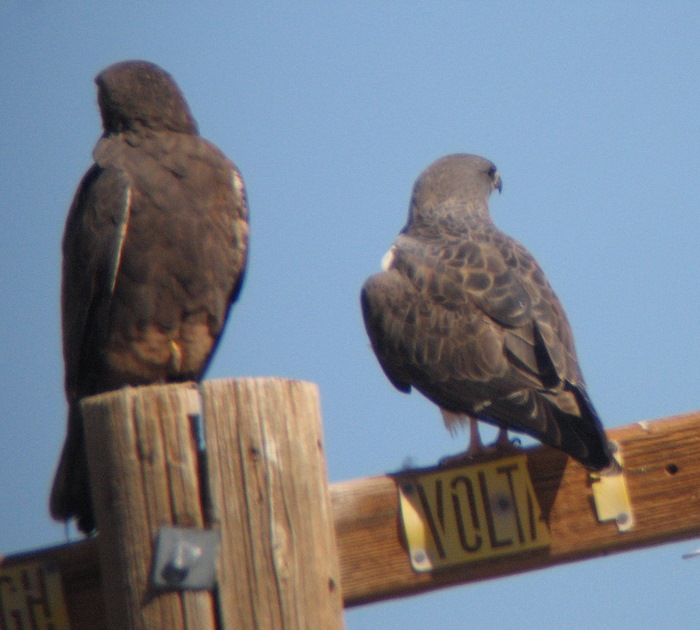 Hi Birders. I led my 17th trip for Los Angeles Audubon this past weekend and it was most enjoyable. The temperatures in the valley were very warm! At one time, 90 degrees was recorded on the valley floor! We had the pleasure of observing a first year Bald Eagle on the Sherman Grade heading north on the 395. It was perched on a rock alongside the highway - good eye Nick!! Another was observed swooping fish out of Lake Crowley. We observed over 70, quite possibly 90 male Greater Sage Grouse at the Crowley Lake lek. Fascinating was watching the males march up to the lek in procession. It reminded me of penguins! Added to this spectacle of displaying males was a Short-eared Owl coarsing the flat sagebrush and grasslands close to the lake. What a perfect sight! The grouse displaying and sparring and the owl flying about with the snow covered Sierra in the background - a most perfect sight. The turn off to the hot springs beyond the road to the lek on Benton Crossing we saw Sage Thrashers. They were heard singing at the lek and a Prairie Falcon zipped by at the lek as well. We came across Pinon Jay at the forest on 120 past the Tuffa Towers at Mono Lake. The area north of Bishop and around Crowley Lake was sure dry as was the forest near Mono. We also saw two Caspian Tern as Benton Crossing curves just past the dump site turnoff. Aspendell had a huge flock of Grey-crowned Rosy Finches at Ken's feeders. A number of Red-breasted Sapsuckers were here too. Sharon Ford reports an aberrant Rosy with lots of brown on the head. A female Slate-colored Dark-eyed Junco was a treat behind her house as we also watched Rosy Finches bathing in the stream. At Chalfant Valley, we failed to locate the radio tagged Swainson's Hawks but we saw about 20 hawks along the stretch from the north of Bishop to the last green ag field. A pair was observed mating on the telephone pole!! I've attached a digiscoped photo of this pair, the female is the dark morph. They were screaming to the skies as another pair was flying over head - turf wars! A single Golden Eagle was perched in a tree near a ranch. A single female Common Goldeneye was as at Nik & Nik as were a pair of Short-billed Dowitcher. Finally, the Sooty Grouse this time was found waaaaaayyy up behind the pack station at Glacier Lodge, aka Big Pine Creek Canyon. It was pretty sunny and warm here but we were rewarded with a nice booming male. A Golden Eagle was flying above the ridge in the canyon. Always a pleasure visiting this area this time of the year. We have to return back for a quickie trip as our Jeep's water pump broke Saturday morning. Happy Birding! Mary & Nick Freeman, Glendale, CA