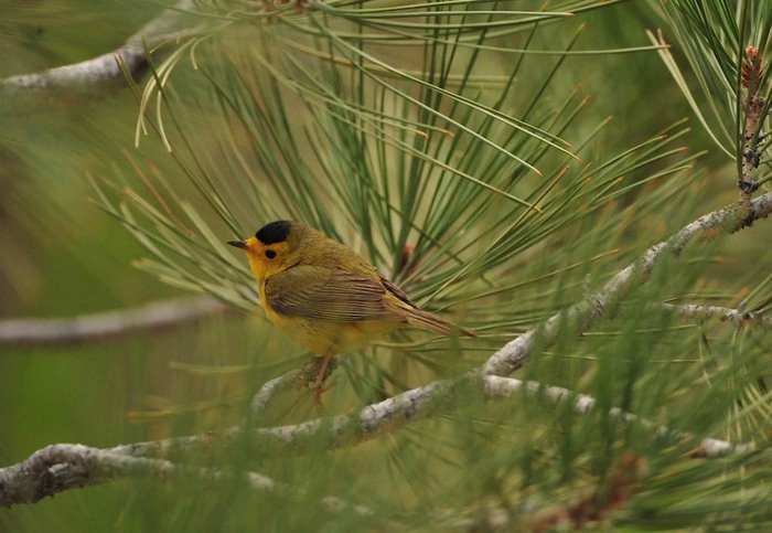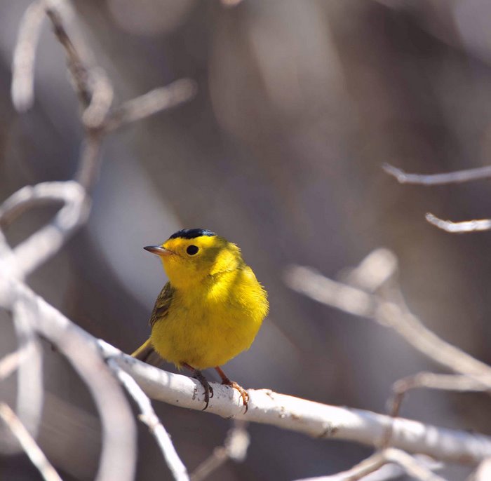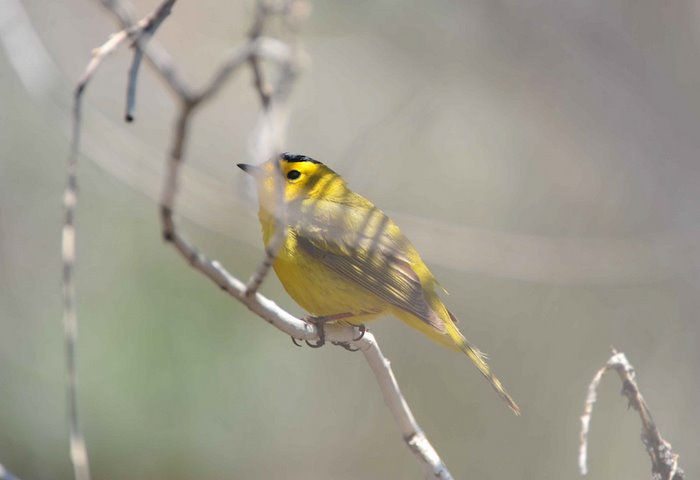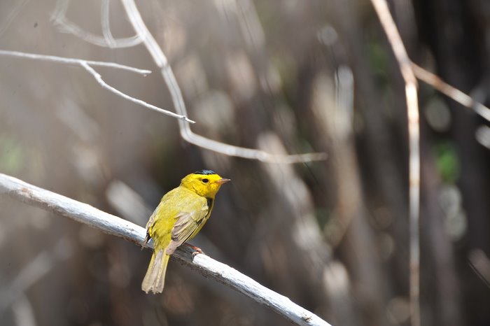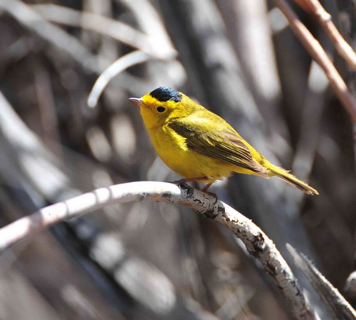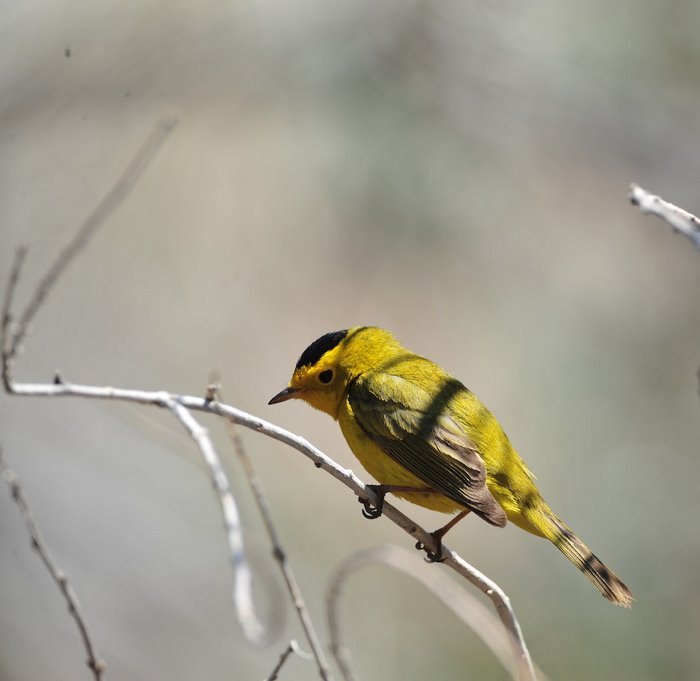 Wilsonia pusilla otherwise known as Wilson’s warbler comes in 3 races: W.p. pusilla, W.p. pileolata, and W.p. chryseola. I believe that the photos I enclose show the race chryseola. In the PRBO data, chryseola is said to breed west of the Sierra crest and west of the Cascades in WA state. The race W.p. pieolata breeds in the Warner and White mountains of central eastern CA (A.O.U., 1957). Dunn & Garrett (1997) suggest that the boundaries of chryseola and pileolata in eastern CA “need clarification.” According to Dunn and Garrett (1997) the Western montane populations of chryseola and pileolata are found in willow and alder thickets at or near treeline and also in montane meadows. I found abundant numbers of Wilson Warblers in wet meadows and near seeps and marshes and the stream that runs through this particular riparian habitat. The race pusilla is found on the east coast and only as a vagrant in the west. As far as appearance, the race chryseola is the brightest yellow of the 3 races and the forehead and lores are a yellow-orange in many males. This is what I saw in the large flock that spent several weeks in the Convict creek drainage area above Crowley Lake. This area, below the green church at Benton Crossing, is a sage, willow, alder, dwarf birch and aspen riparian habitat. Near the creek the willow are large, old, and numerous interspersed with alder, dwarf birch and aspen trees. (Although the aspen grow in meadows and are not numerous.) The willows, alder and birch create a very dense understory. The Wilson’s chryseola have an almost bright yellow-orange forehead in the adult males. One can see this coloration in some of the photos. David Gaines (1988) in his wonderful book, Birds of Yosemite and the East Slope, experienced the Wilson’s warbler in probably the same manner as did I. He states: “While one of our scarcer nesting birds, Wilson Warbler’s are common transients. Large flights pass east of the crest in early May, and through montane meadows in August. At times, these restless little birds flash like golden threads in every shrub and thicket.” The day I took the photos it was a cloudy and overcast day with a strong wind blowing. The warblers I was seeking had been foraging in the tops of aspen trees that were just in the process of leafing out. With the wind blowing strongly there wasn’t a warbler to be seen. As I walked downstream toward the lake I stopped and peaked through the large willow bushes, still without leaves, which lined the creek. I was amazed to see, like rays of sunlight in the gloom, small darting yellow birds landing on the branches overhanging the creek looking for insects and moving on to their next perch. I crawled onto the bank of the creek with my camera and lay on the ground. Here there was no wind blowing, all was calm and quiet; after I settled in and waited a few minutes warbler after warbler joined me until I had counted over 100 of the little birds, both male and female. I started taking photos the birds didn’t seem to mind my presence and were very inquisitive about the click of the camera and at times would land within several feet of me or closer looking for the unusual noise that my camera made. The next day I returned to the same spot, however, all was quiet, my vibrant yellow birds had moved on.