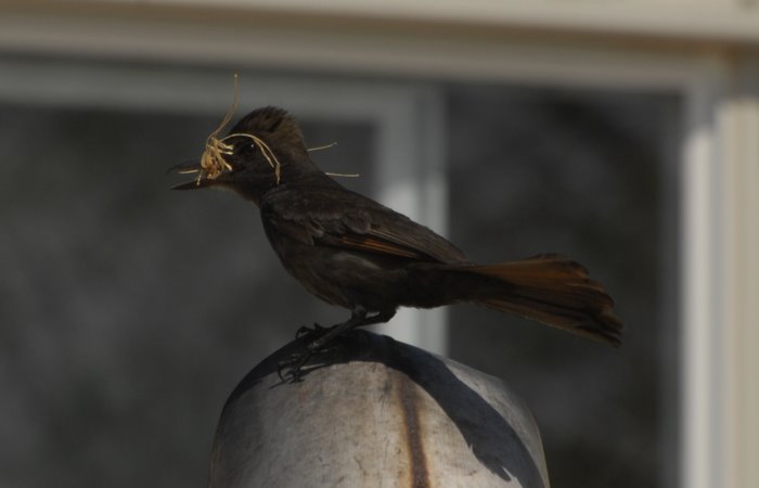 I photographed a "melanistic" Brown-crested Flycatcher at China Ranch this morning. After reading a recent article in Birding, I think I am more confused about the proper term for the aberrant plumage this bird was sporting - but this bird was basically black. The rust in the primaries and tail (at least mostly) was present. The bill was very black. This bird was paired with a normally-plumaged bird and seen collecting nesting material. Their territory is right behind the gift shop.