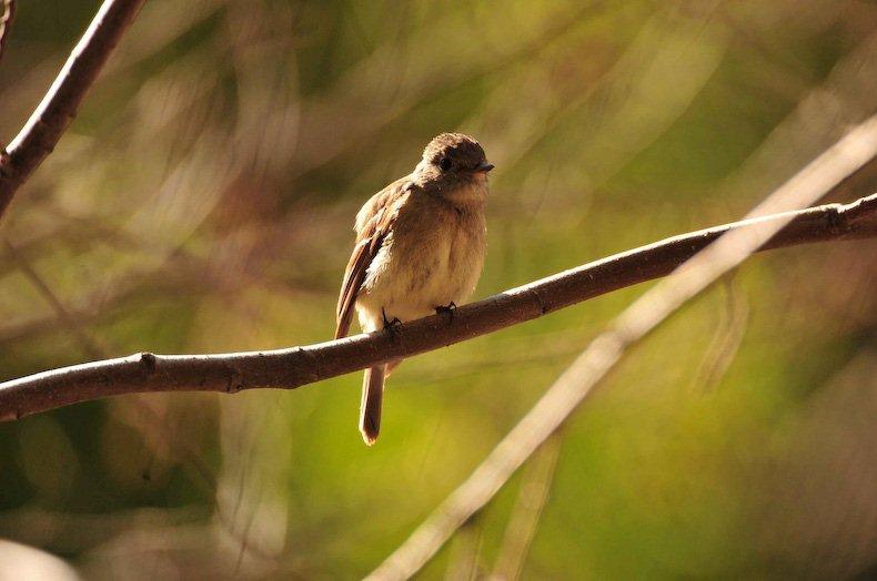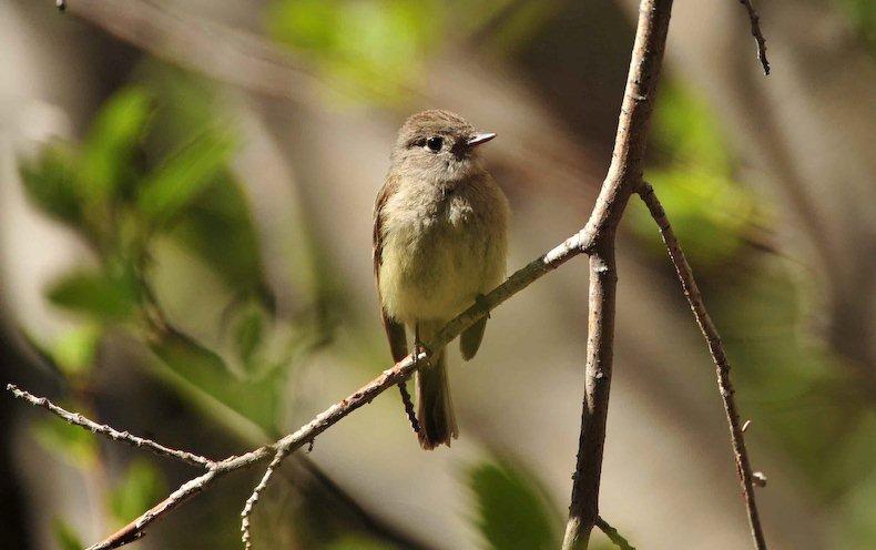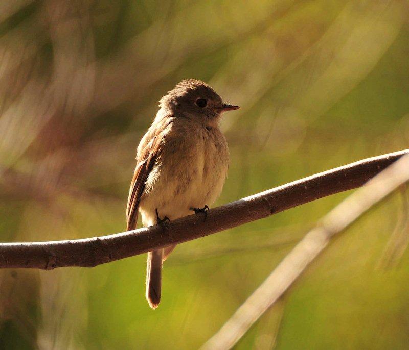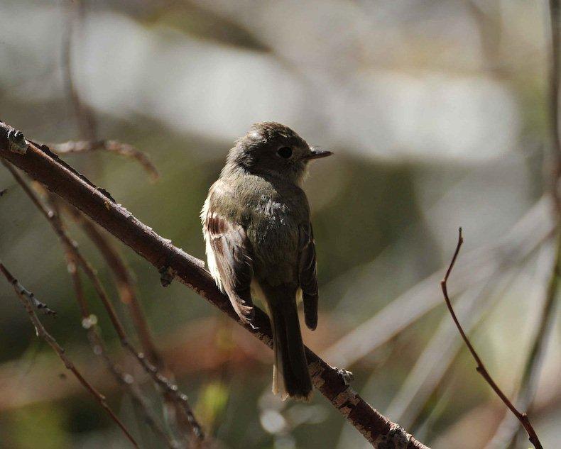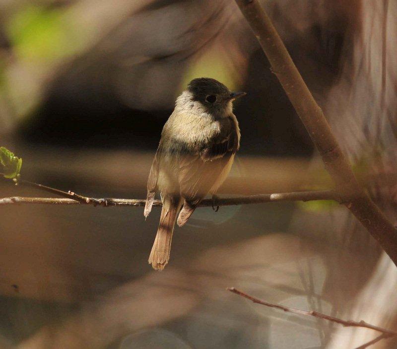 The past month has seen many migrants either flying in for a summer stay or passing through on their way farther north or just elsewhere. One of the many bird species I have seen of late has been the 5.5" empidonax, the Pacific slope flycatcher. At the creek (Sherwin) where I frequently walk and watch the birds there has not been an empidonax there in the spring for several years now. Yes, we have the Western wood peewee, which is a Tyrant flycatcher but not a member of the genus empidonax. When I first began walking along this creek some 7 years ago I used to see this little bird; of course, it might have been a different empid I can't swear to its being a Pacific slope FC. I didn't take such detailed notes back then as I do now. I believe this tiny little empid, with the alluring white eye-ring, the heavy beak with the startling orange mandible and the black maxilla, the black feet and the striking white wing bars is a Pacific slope flycatcher (I could be wrong and it could be the Cordilleran flycatcher which is almost identical to the PSFC). However, my preference is that this little guy is the PSFC. I am not an expert and so I cannot be certain. But one of the things in favor of my choice is this little guy likes to forage and catch insects low to the ground. He swoops down or up from low-hanging alder branches or from bushes growing on a hillside slope above the creek. He likes to flick his tail and sometimes his wings. He is camera shy and didn't want to have his picture taken except one sunny day around noon with insects buzzing around us I sat on the ground and he foraged and swooped from inside an alder bush growing next to the creek. It was just one of those days when he didn't mind if I was nearby. The stretch of creek I walk is several miles and along this bit of Sherwin I have seen maybe 4 or 5 of these little empids. I don't know if they will stay the summer, breed, nest and fledge their young or maybe move on; time will tell. But it sure is nice to have them around again right now.