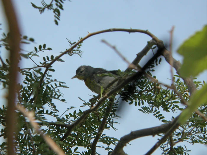 Brie and I observed this bird at close range at 11:10AM at Amargosa Canyon. We flushed it up from a small trickle of water that crosses the trail where it had been bathing. The yellow throat, greyish body, white above and below the eye, pale lower mandible, small white wing bars, and greenish mantle were all observed. A small amount of red could barely be seen on the breast so I suspect this bird is a female. Since the bird had been bathing, it was more difficult to observe the colors. Luckily the bird was curious enough to respond to my pishing and I was able to get a record shot of it through my binoculars before it disappeared. Three singing Indigo Buntings were also present in the canyon, and the previously reported nesting attempt failed after less than 70% of the nest has been constructed. White-winged Doves also remain in the canyon.