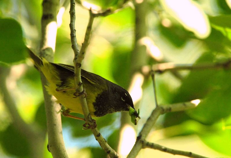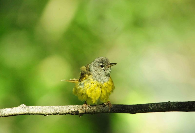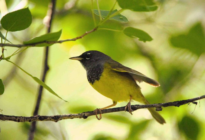 Although not an unusual bird per se, it is a warbler that is hard to spot. For those who may not know it, the Mac's nest up here near Mammoth on a small stream in a very dense jungle of a forest that lines the stream. The trees are deciduous; many of them old primary aspen habitat and secondary forest coming up all around and under the aged aspen. Dead aspen lie thick on the forest floor and the understory is dense with Wood's roses, columbine growing everywhere and stinging nettles. You will not find a human presence in this dense growth and it is here that many, many birds nest, among them the Mac's and Yellow warblers. The FG refers to the MacGillivray's warblers as a "skulking" warbler; however, when the Mac's nest they cease being a skulking bird and make their presence known as they flit through the branches of trees and bushes collecting large green caterpillars for their chicks. The following are some photos of a beautiful, lively and inquisitive warbler pair with 3 chicks in their nest hidden amongst stinging nettles about 3" off the ground. I hope you enjoy them as much as I have.