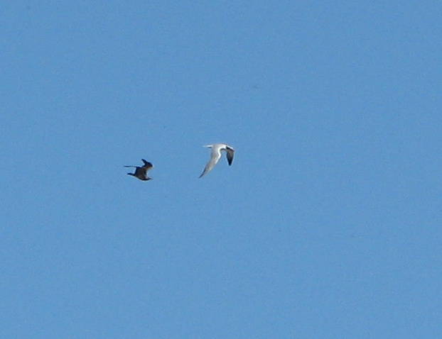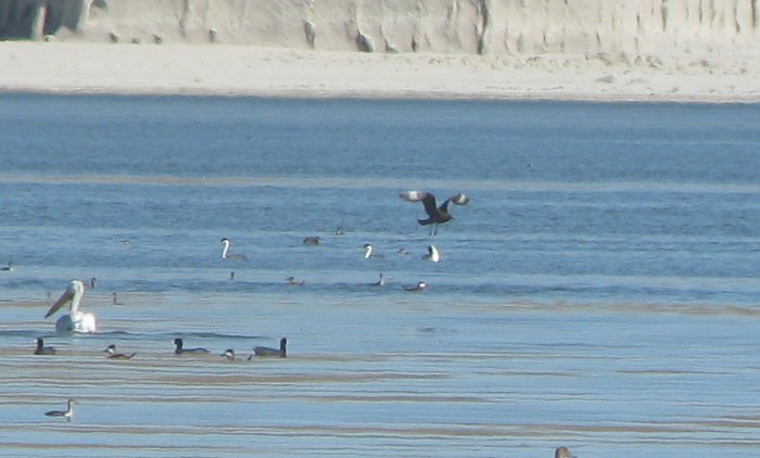 Crowley this afternoon was spectacular. Moments after arriving I spotted a juv Parasitic Jaeger (a bit of overall rufousness, and white windows above and below in the wings) giving the Avocets some grief. It divided it's time between tranquil repose on the water and half-hearted attempts to coax food out of 2 Common and 3 Caspian Terns. Then all of a sudden it flushed up a group of 5 Sabine's Gulls (1 adult, 4 juvs) and chased them around. Something I've always wanted to see...a Jaeger attacking a Sabine's in the eastern sierra. 3 Sanderling and 5 Short-billed Dowitchers were the only other shorebirds. And this morning at Deep Springs, there were 8 species of warblers (all western species), the coolest being a male Townsend's and a Yellow-breasted Chat.
