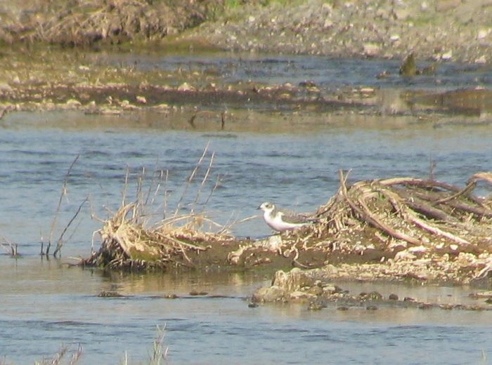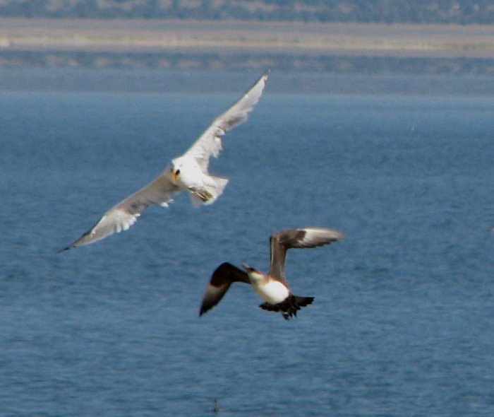 A single Solitary Sandpiper circled the Rush Delta at 7:30 this morning, calling repeatedly. Tringa shape and flight style (graceful and bouncy), short legs, short bill, and that unique upper tail with white rump bisected by a dark line and several lateral lines. It never settled down to land, flying upstream and out of sight instead. The adult Parasitic Jaeger was still around and still giving the California Gulls a taste of pelagic terror. And the immature Sabine's Gull was also still there.
