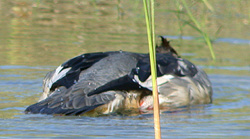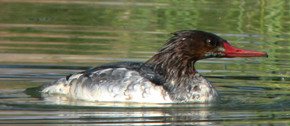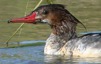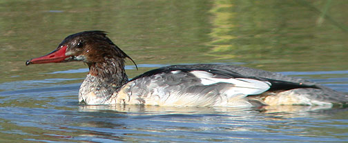 This merganser, in all likelihood a Common, was found on 2 Nov 2002 at Furnace Creek Ranch, Death Valley National Park. The bill structure (thick at the base, nostrils 1/3 out from the base) fits Common ok, but many observers thought the fuzzy throat demarcation and shaggy, elongated crest was more like Red-breasted. It's been suggested that this is a male Common Merganser molting out of eclipse plumage, a plumage usually only seen far to the north of Inyo County...making this a very interesting merganser!
